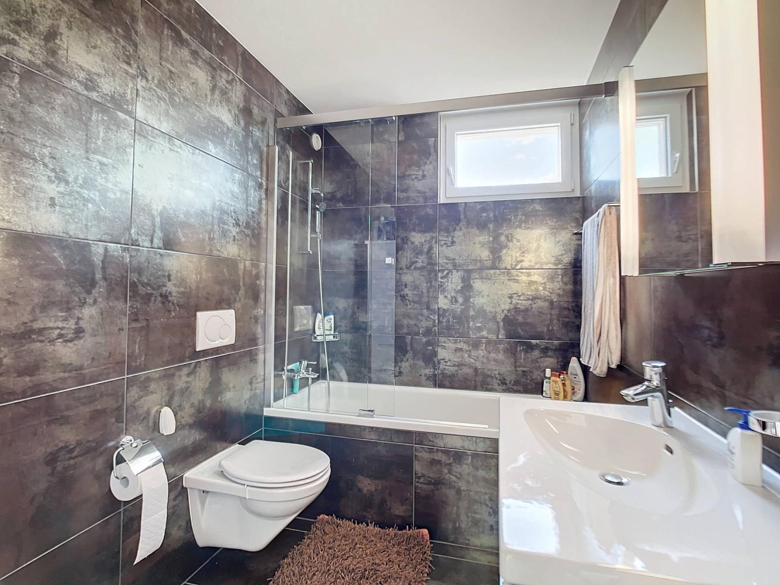 Pour assurer confort et intimité, cet appartement possède une salle de bain avec baignoire et colonnes de lavage, une salle d’eau avec douche italienne et WC.