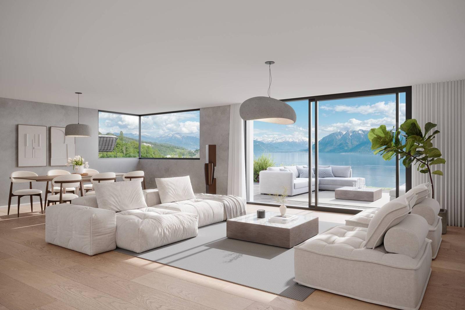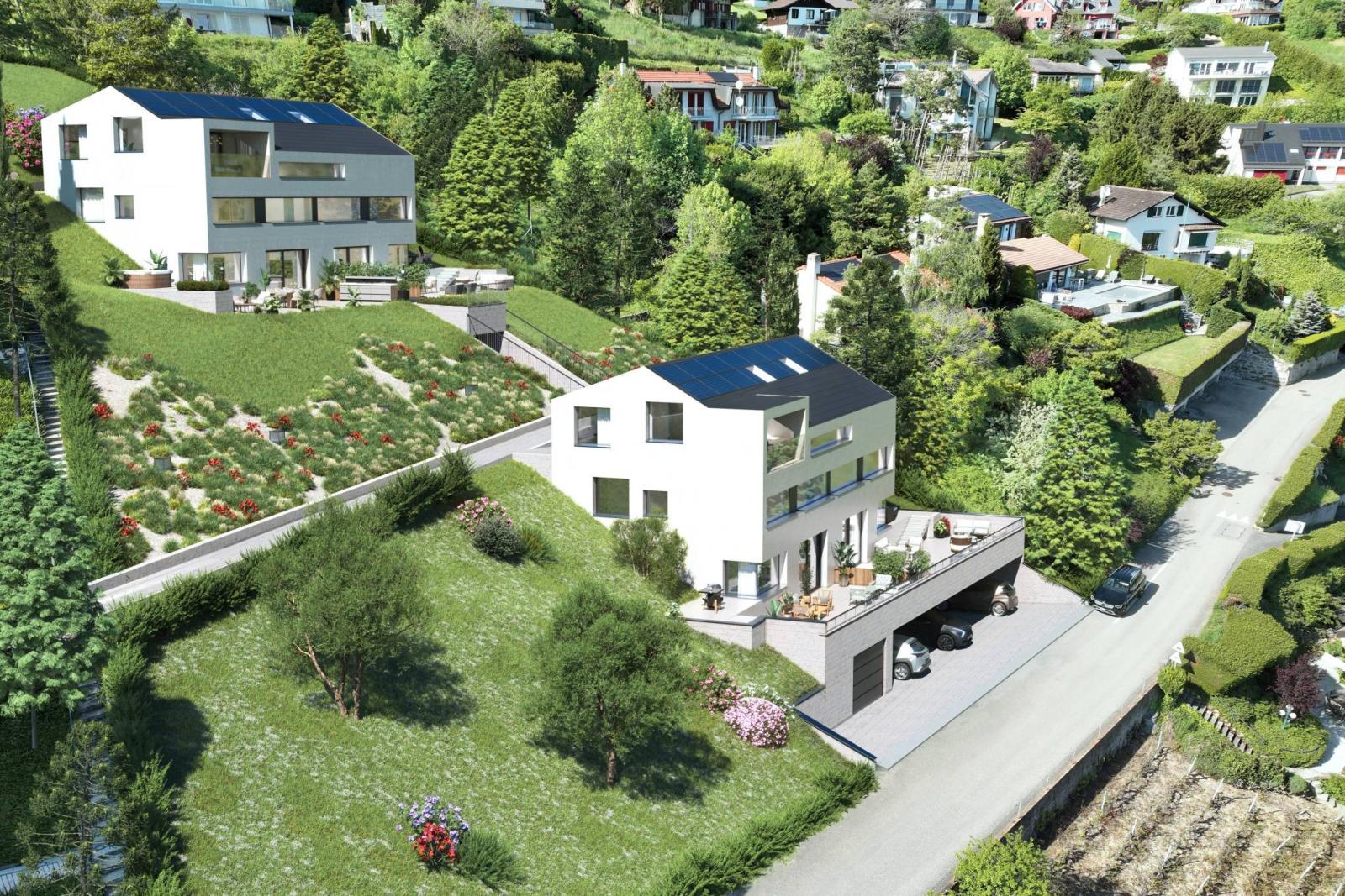 Situation du projet : Terra Panoramica est nichée au cœur de Grandvaux, commune viticole classée au patrimoine mondial de l'UNESCO et à la vue imprenable sur le Léman et les Alpes.