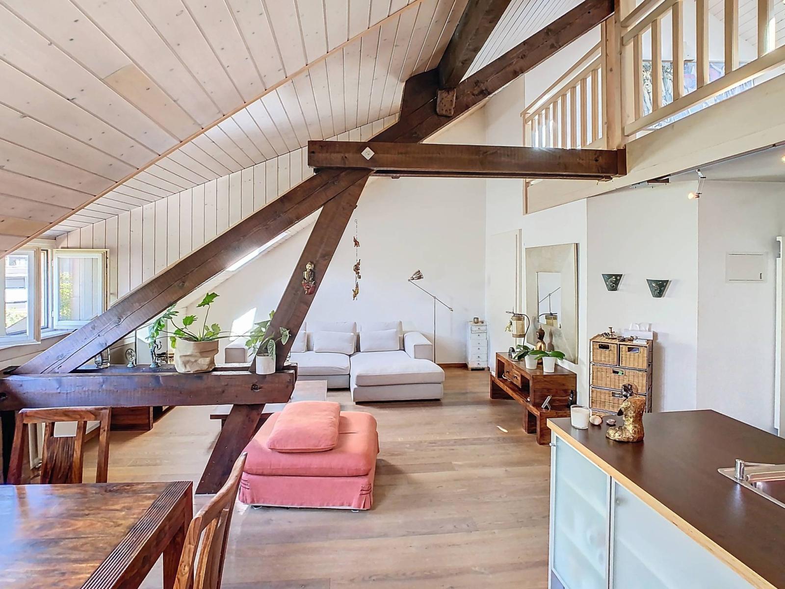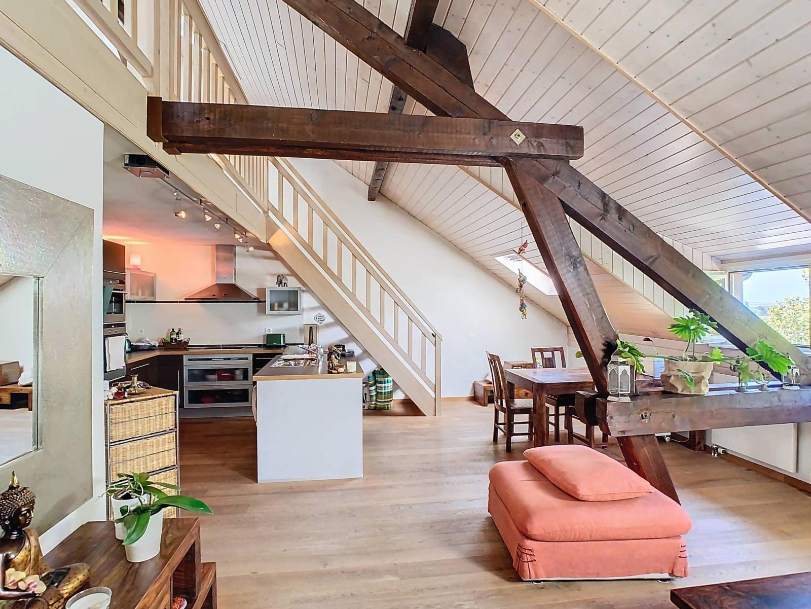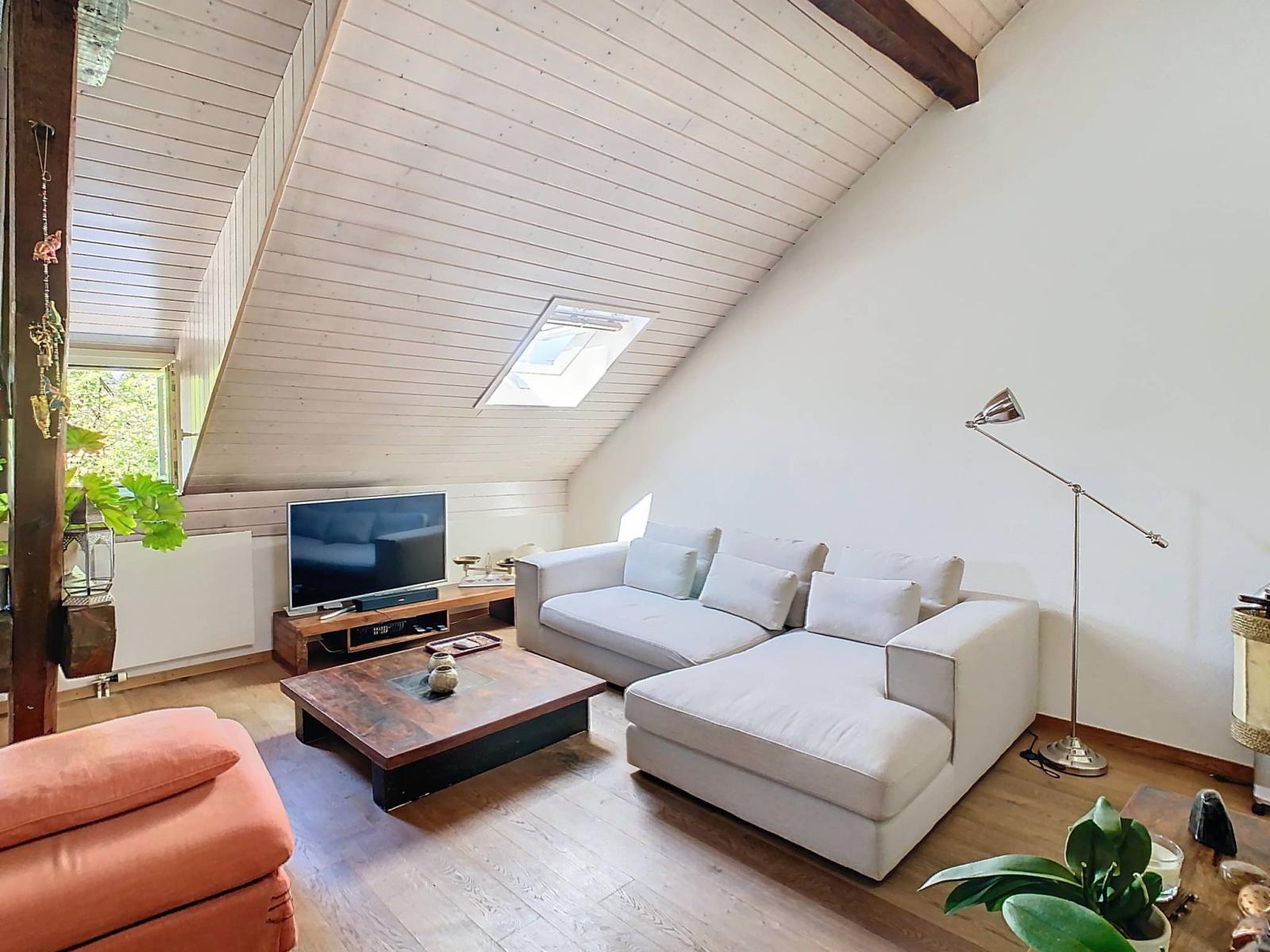 Ce charmant appartement traversant de 4,5 pièces se situe au 2ème et dernier étage d'une petite copropriété (sans ascenseur), dans le village de Perly.