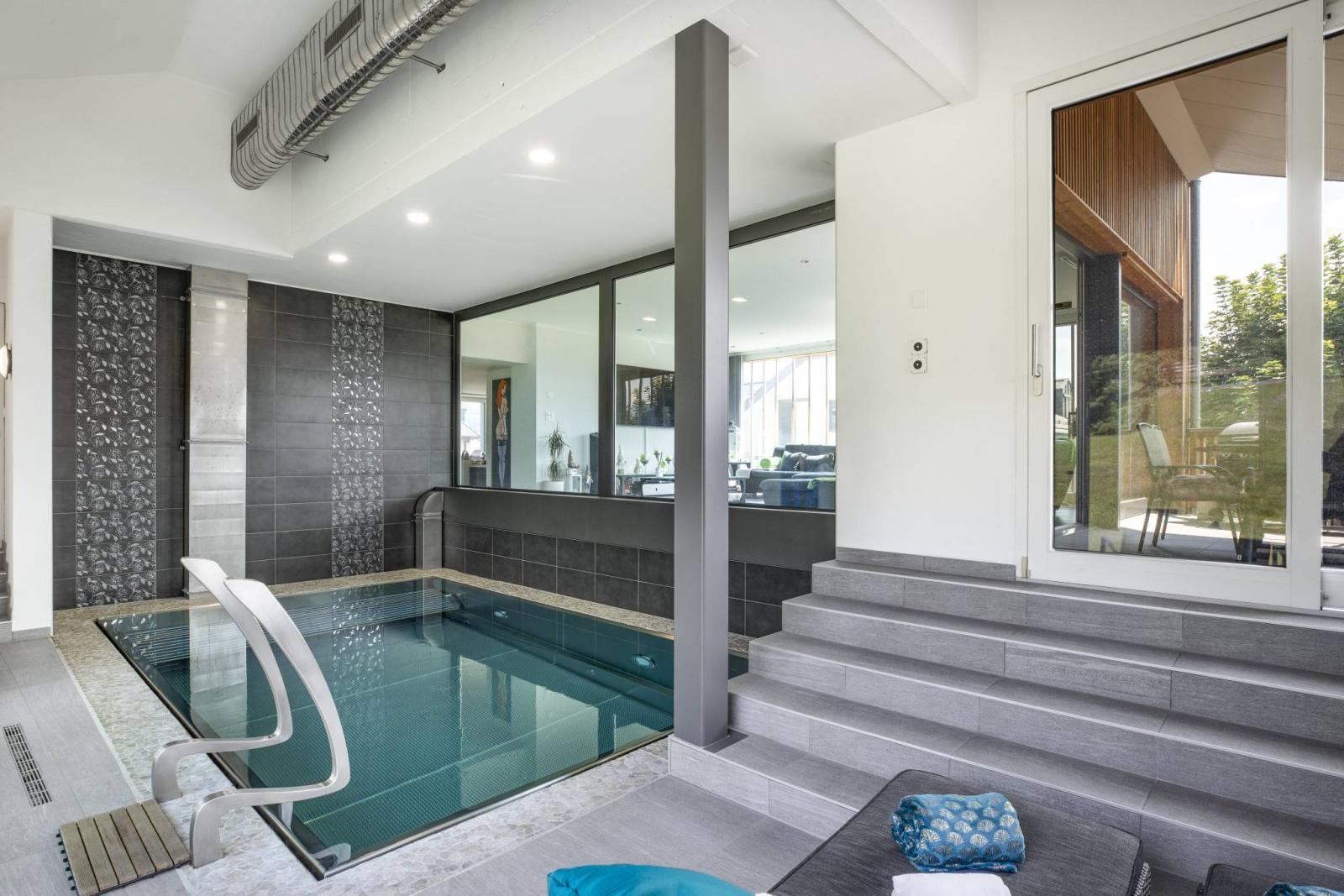 Une magnifique piscine intérieure à débordement, fabrication en inox, avec nage à contre-courant et massages d'eau sous pression, offre une plus-value indéniable à ce bien exception.