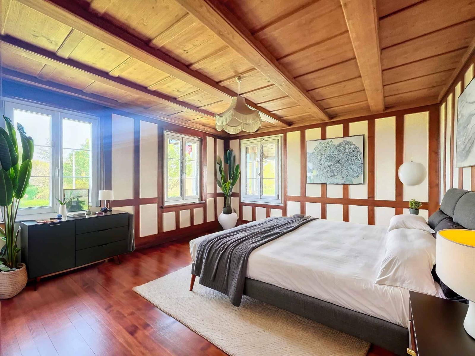 L'étage, dédié à l'espace nuit, comprend deux chambres à coucher dont une avec une armoire, une bibliothèque pouvant être utilisée comme chambre d'appoint, une chambre d'enfant, ainsi que 2 salles de bains.