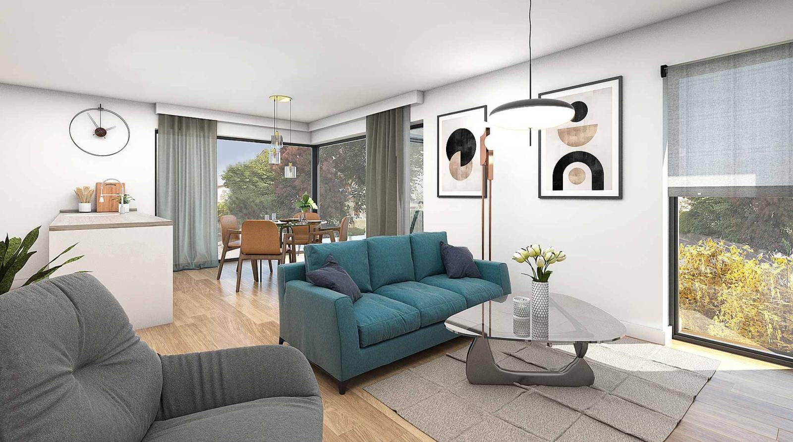 - Grands espaces de vie lumineux, avec des baies vitrées qui baignent l'intérieur de lumière naturelle