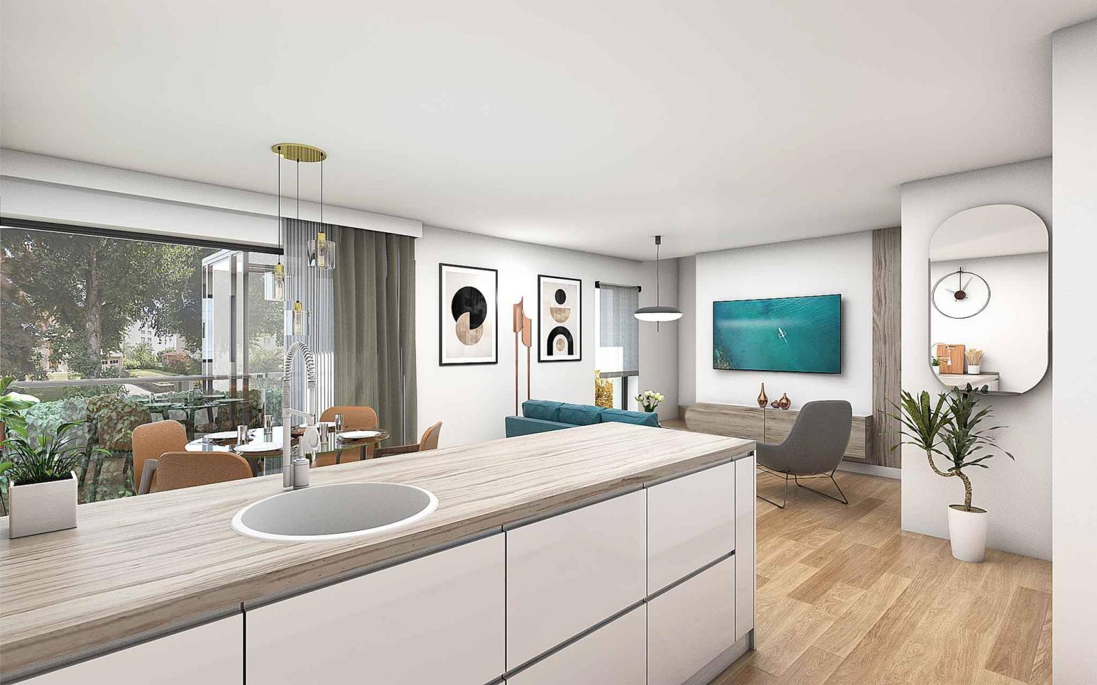 - Cuisine ouverte avec option d’ajout d’un îlot central, idéale pour des moments conviviaux