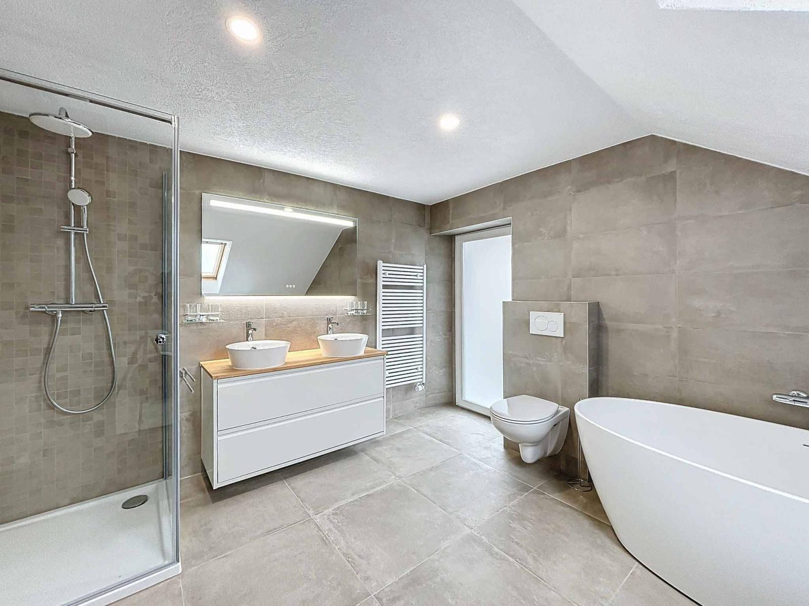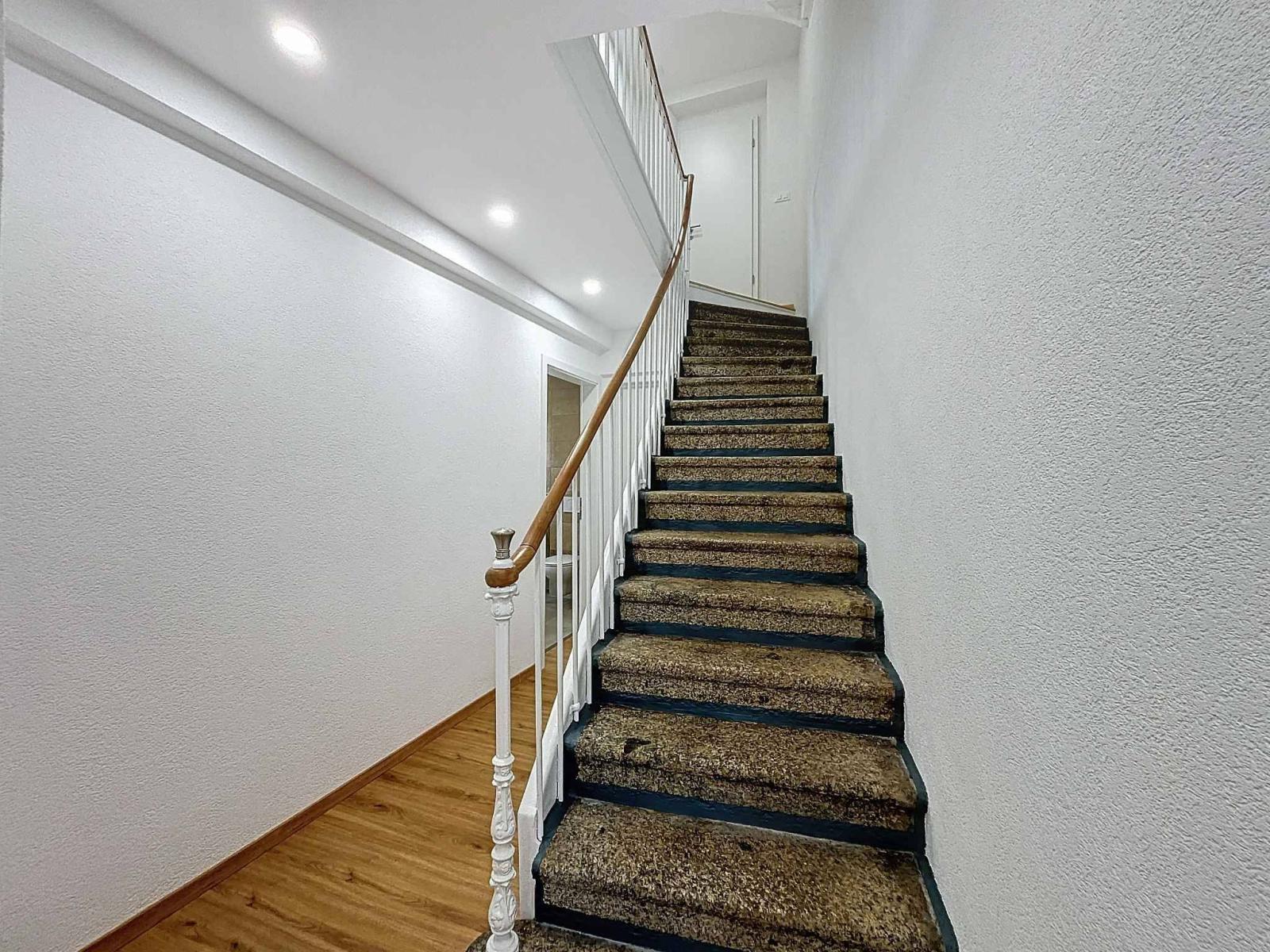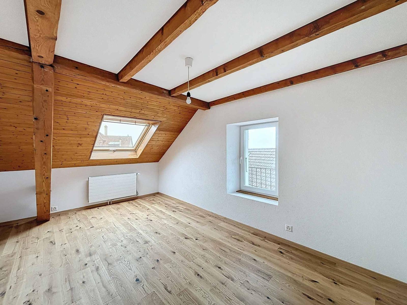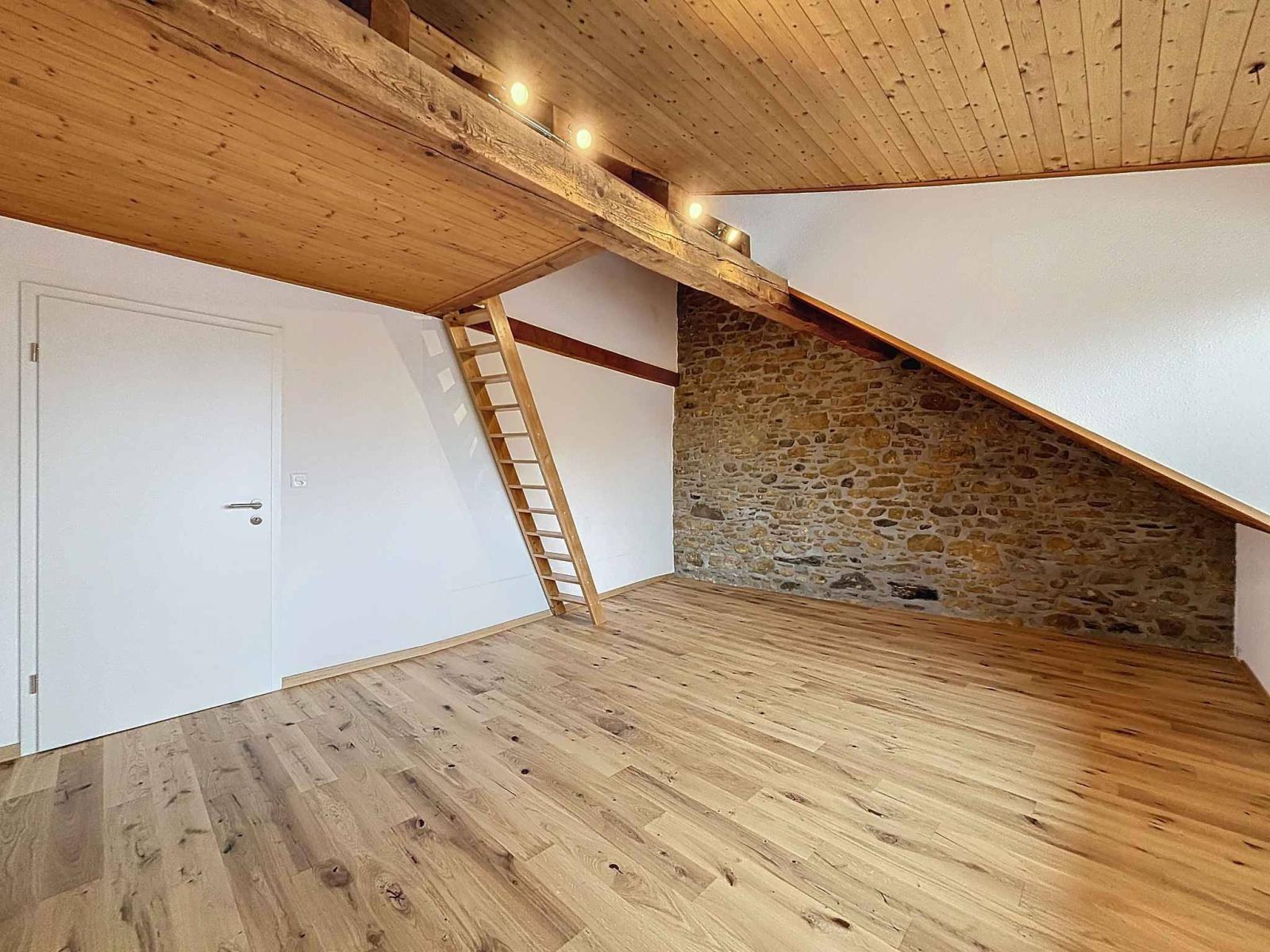 Le deuxième étage est aménagé avec un corridor doté d’une armoire encastrée, une grande chambre avec un mur en pierre et un espace de rangement dans la mezzanine, ainsi qu'une chambre supplémentaire. La salle de bains moderne, équipée d'une baignoire, d'une douche, d'un WC et d'une colonne de lavage, dispose également d'un accès direct au balcon grâce à une porte-fenêtre, apportant lumière, ventilation ou afin de vous permettre de sécher le linge à l'air libre.