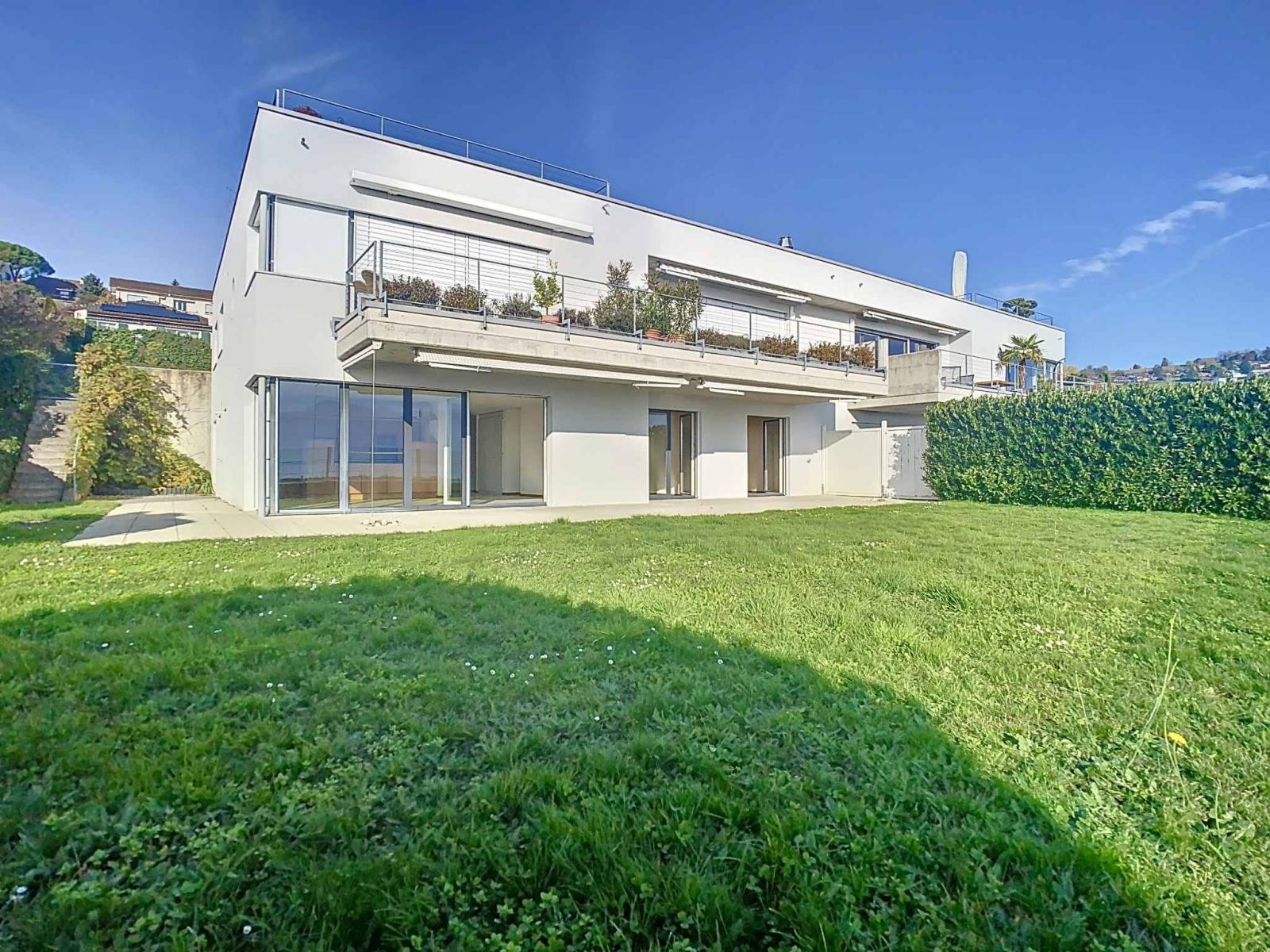 Développé sur un coteau escarpé dominant le bourg de Lutry, la Résidence "Les Blanchettes" bénéficie d'une situation dominante : orientée plein Sud elle s'ouvre sur un angle panoramique de 180 degrés sur le lac et les Alpes. L'ensemble présente trois niveaux en cascade, avec accès aux logements par une allée créée à flanc de vignes.