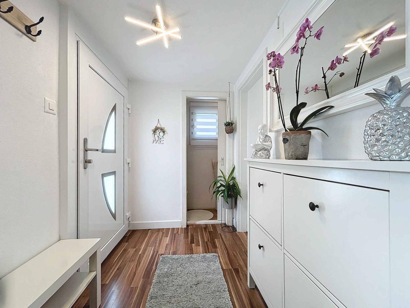 L'accès principal se fait par l'avant de la villa. Dès votre entrée, un hall accueillant vous invite à déposer vos chaussures et votre veste. Cet étage comprend un vaste espace buanderie, une petite salle de douche avec WC, un salon confortable et une chambre à coucher spacieuse de 18 m².