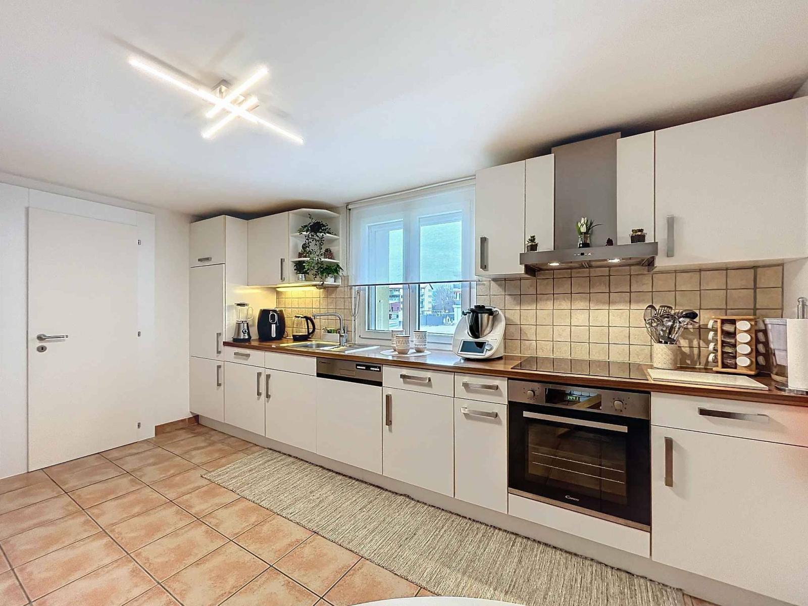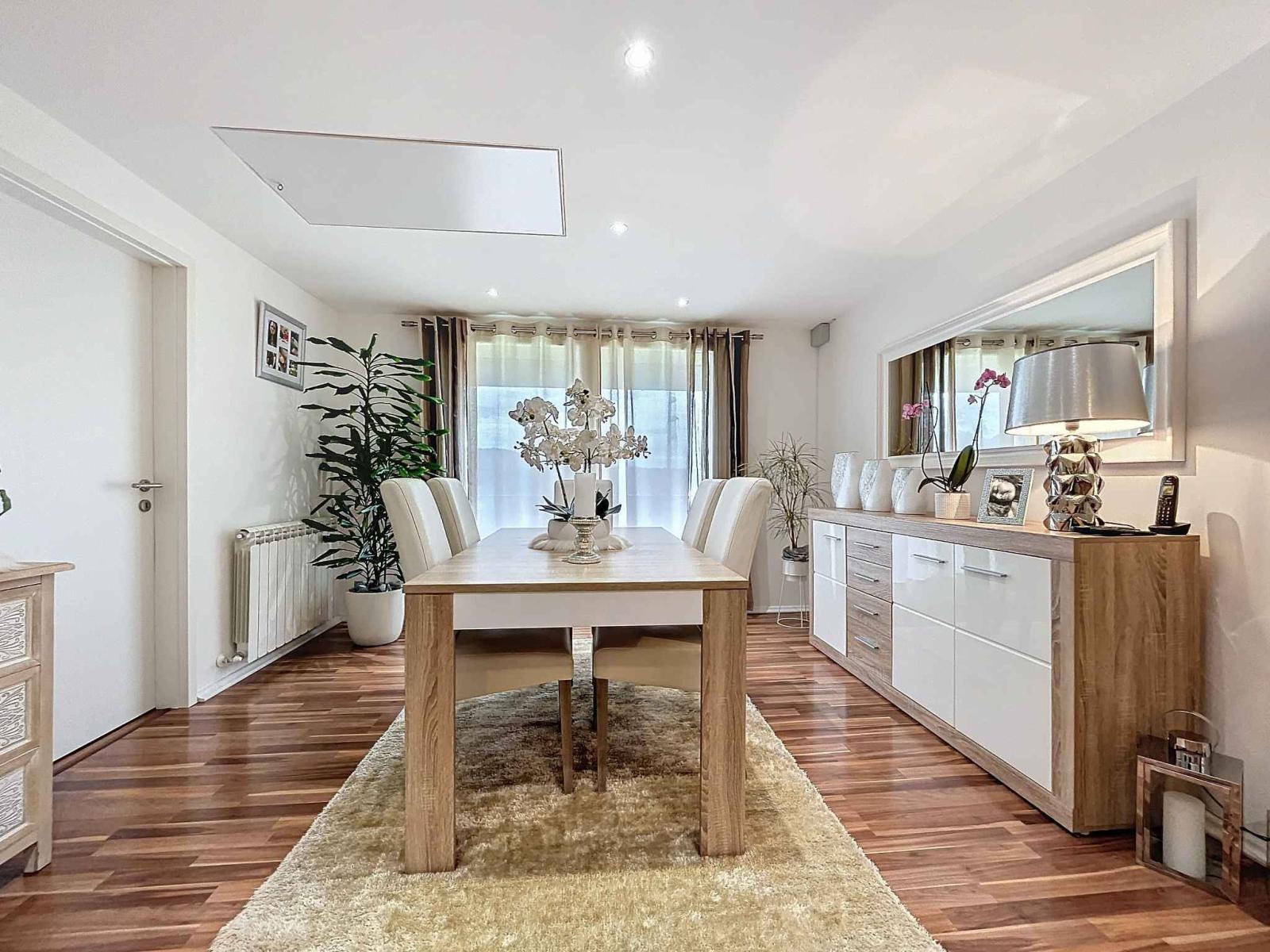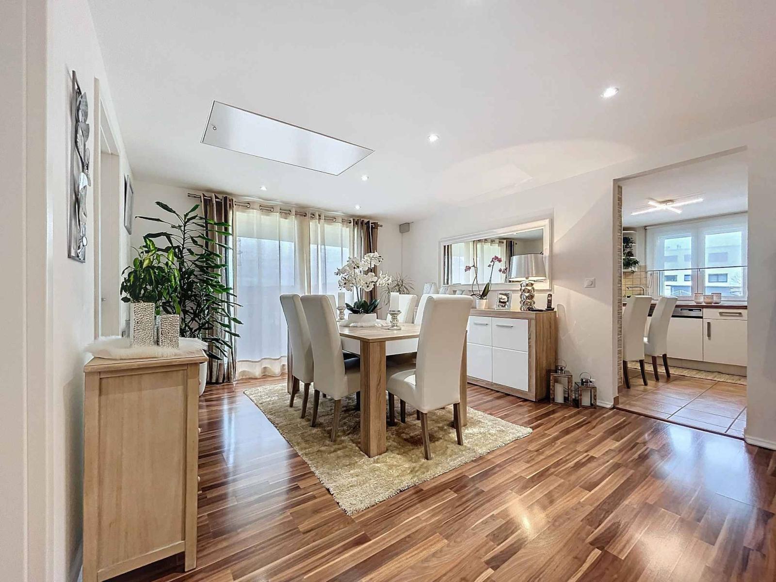 Un escalier vous mène directement à la salle à manger à l'étage. Cette pièce lumineuse dessert deux chambres à coucher ainsi qu'une cuisine entièrement équipée. Vous y trouverez également une salle de bain avec WC. Depuis la cuisine, un accès extérieur vous conduit à l'arrière du bâtiment, directement dans le jardin.