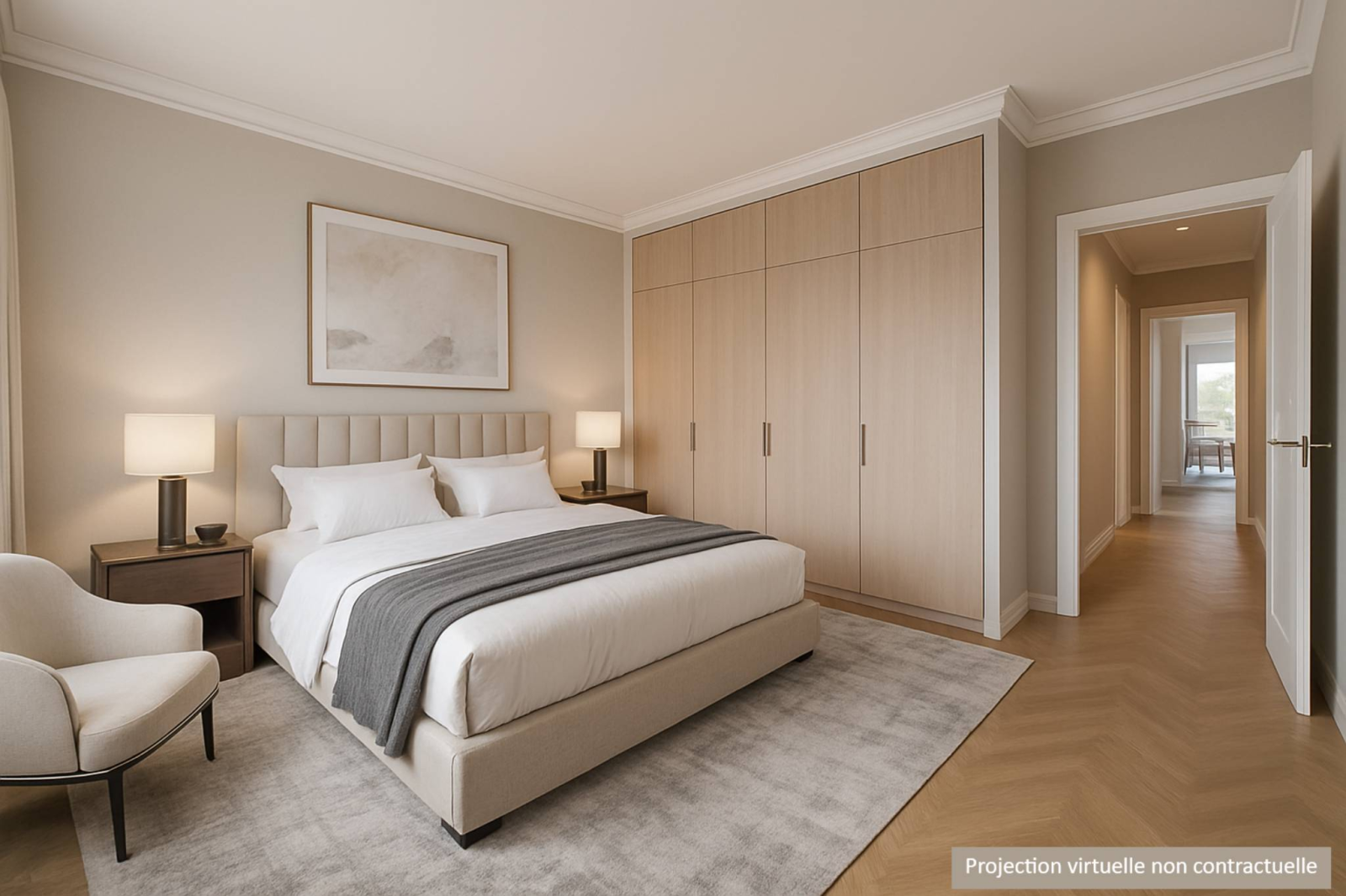 L’espace nuit se compose de trois chambres à coucher, de deux salles de bains et d’une pièce supplémentaire pouvant servir de dressing ou de buanderie.