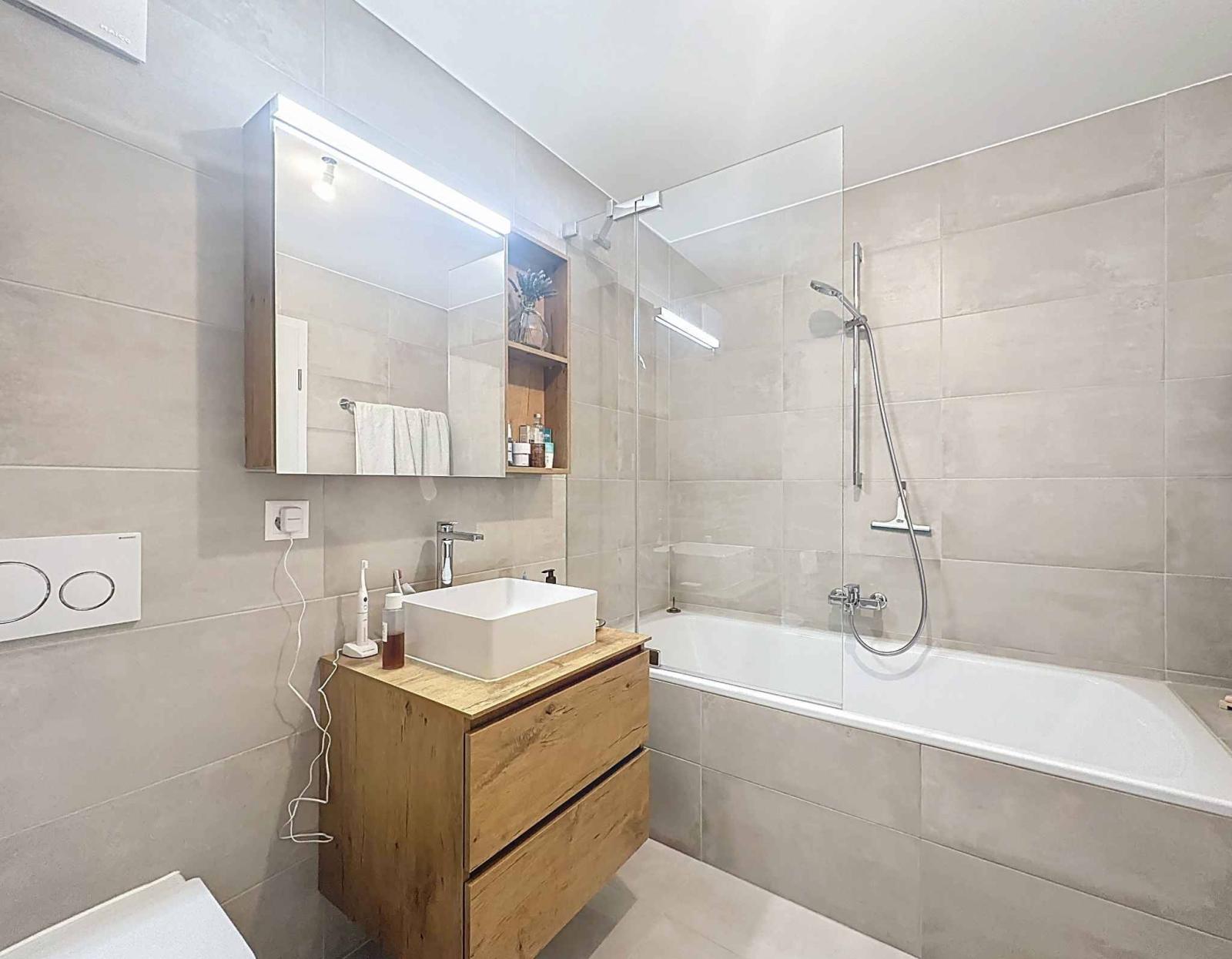 L’appartement dispose de trois chambres confortables, dont deux de 12 m² et une troisième de 14 m², offrant à chacun un espace intime et chaleureux. Deux salles de bains complètent le bien : l’une avec baignoire, l’autre avec douche et colonne de lavage, pour un quotidien facilité.
