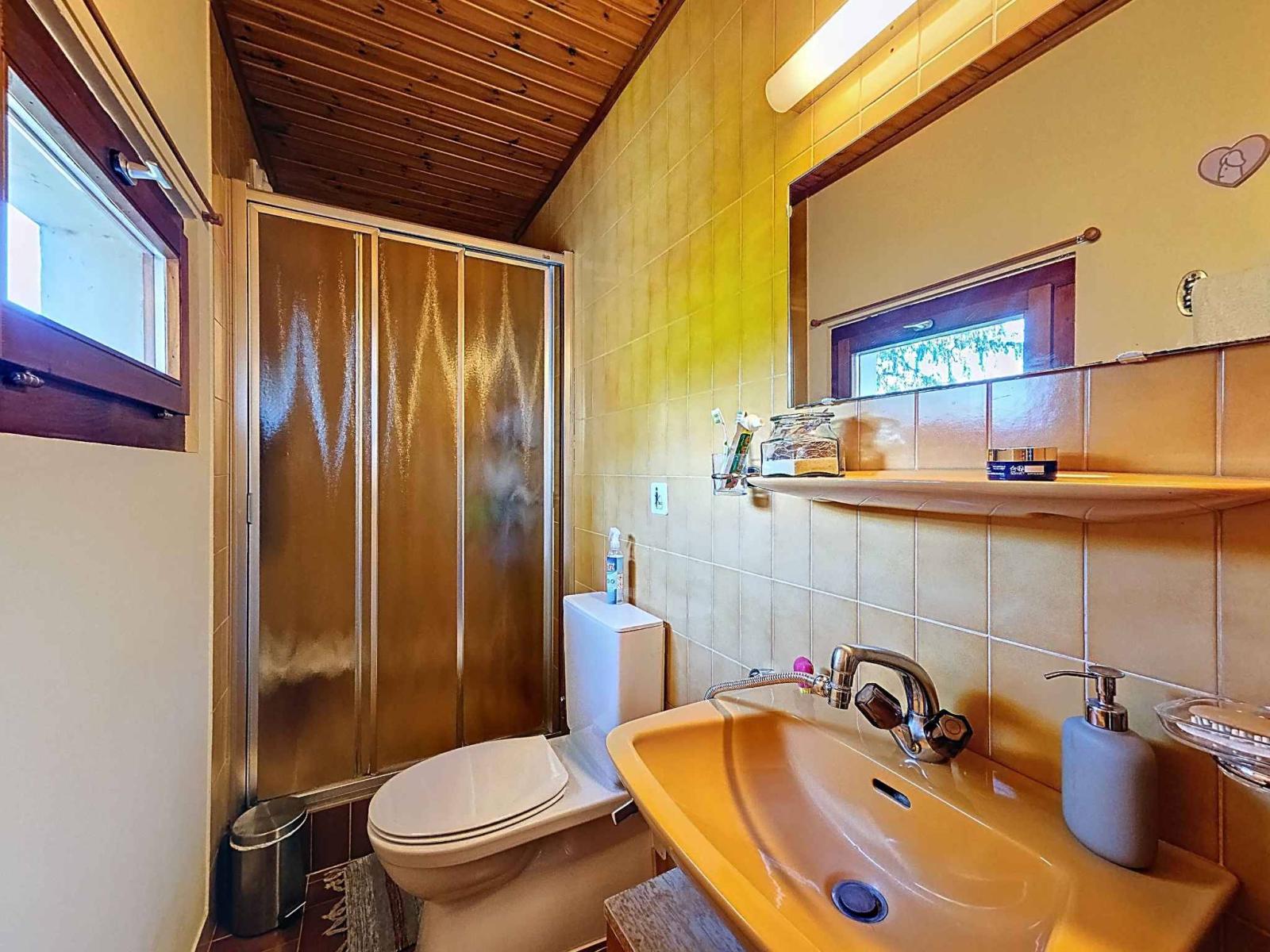 L’intérieur se compose d’un séjour lumineux, d’une cuisine fonctionnelle entièrement équipée, de trois grandes chambres, d’une salle de bains et d’une salle de douche . Une véranda vitrée prolonge agréablement l’espace de vie.