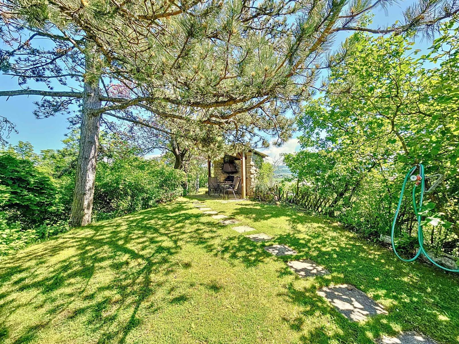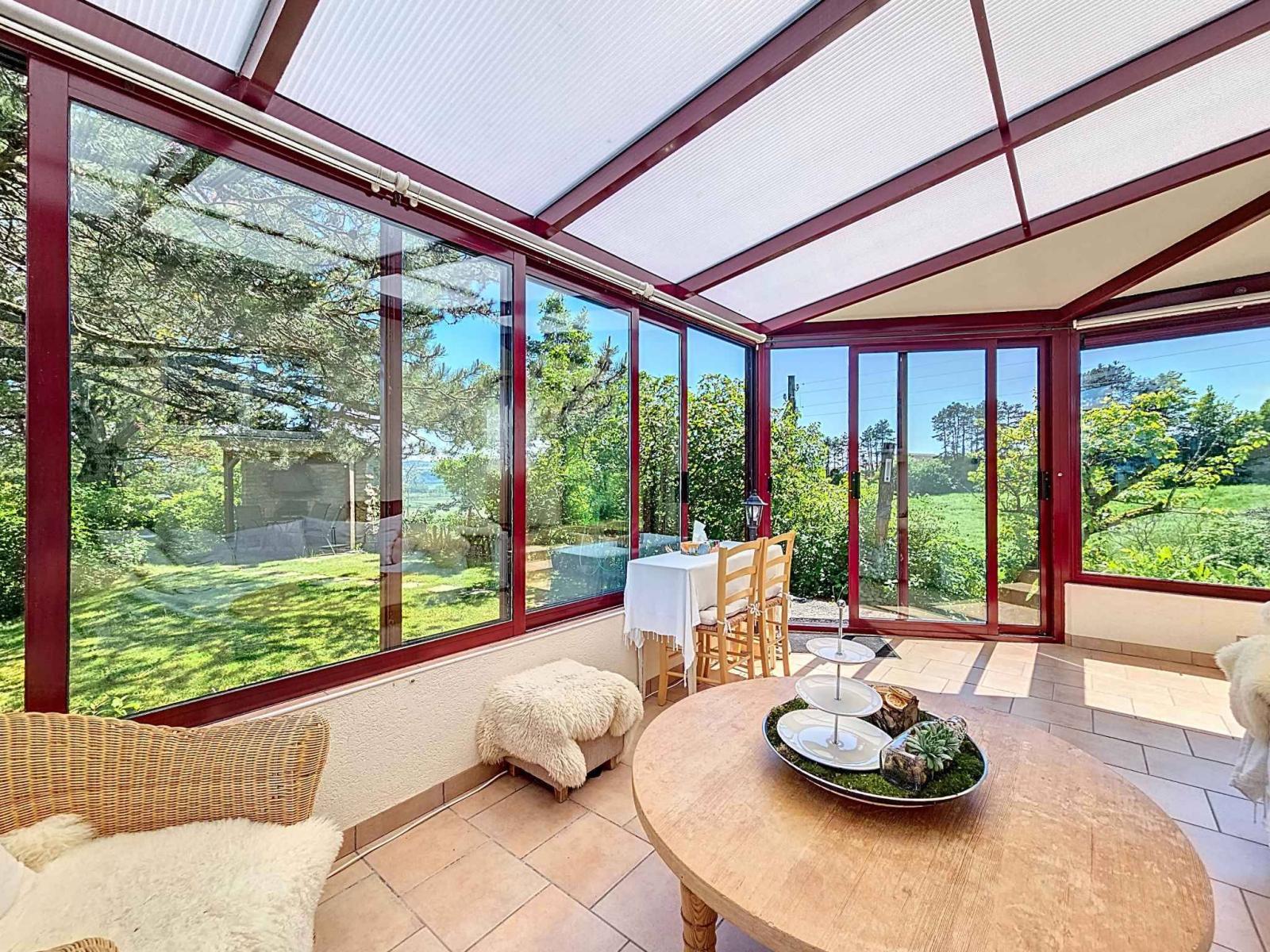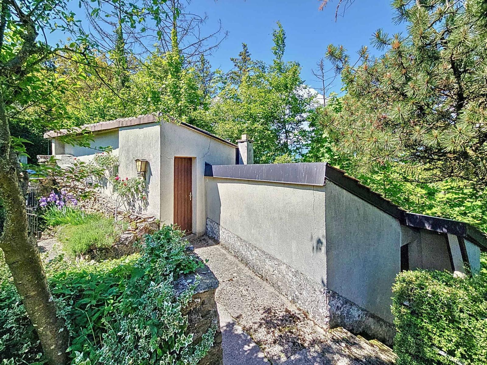 À l’extérieur, une vaste terrasse donne accès à un vaste jardin arboré avec cabanon. Un garage, un local de stockage pour le bois ainsi qu'un carnotzet complètent l'ensemble.