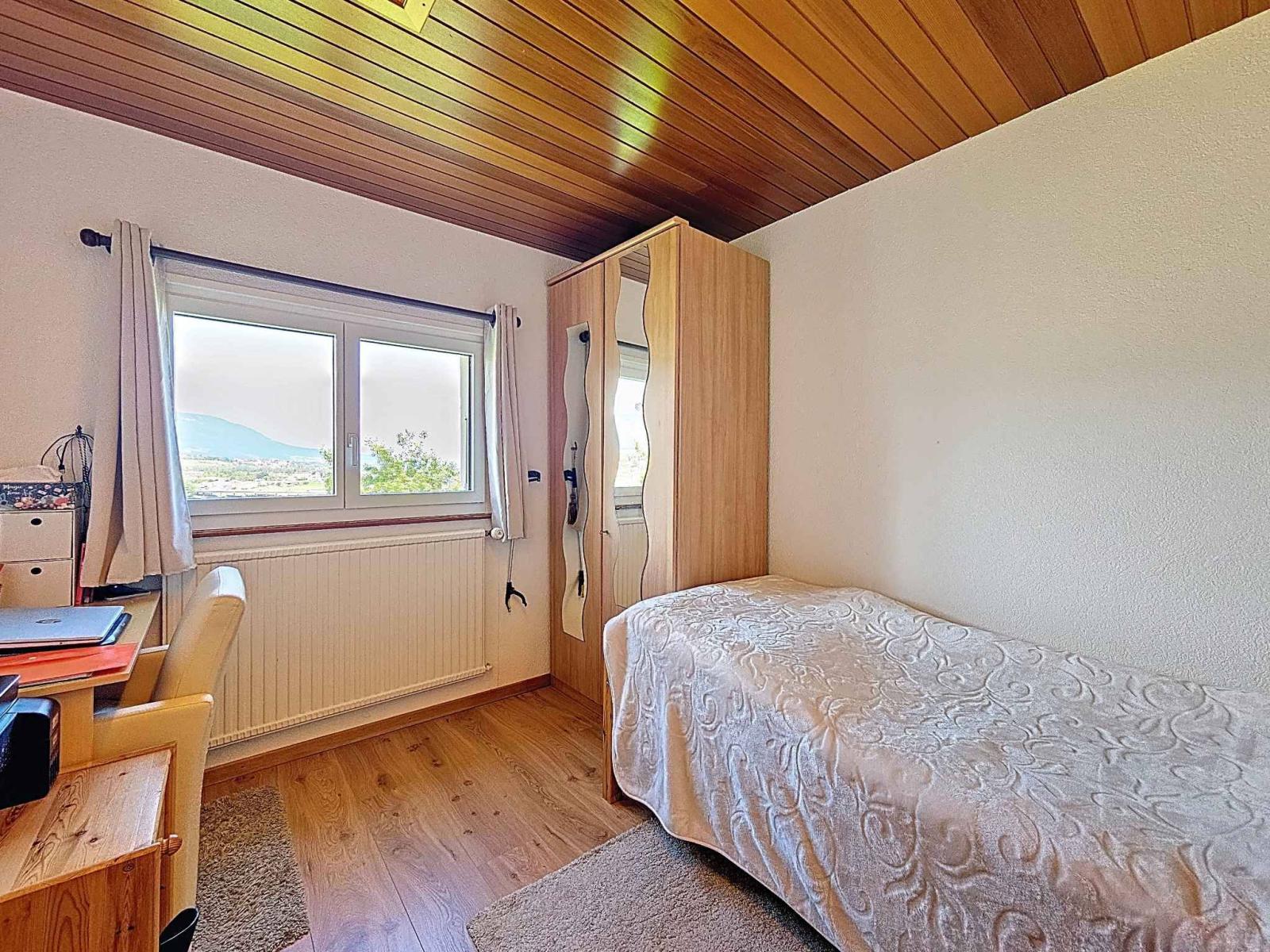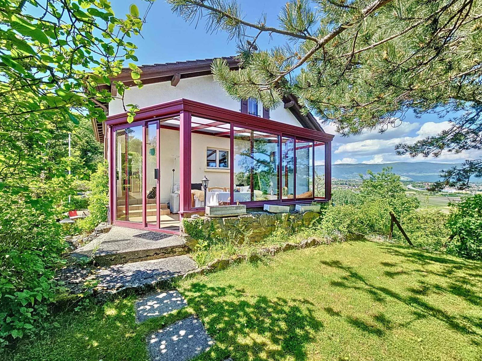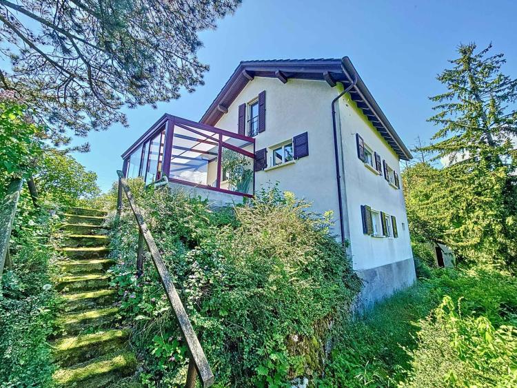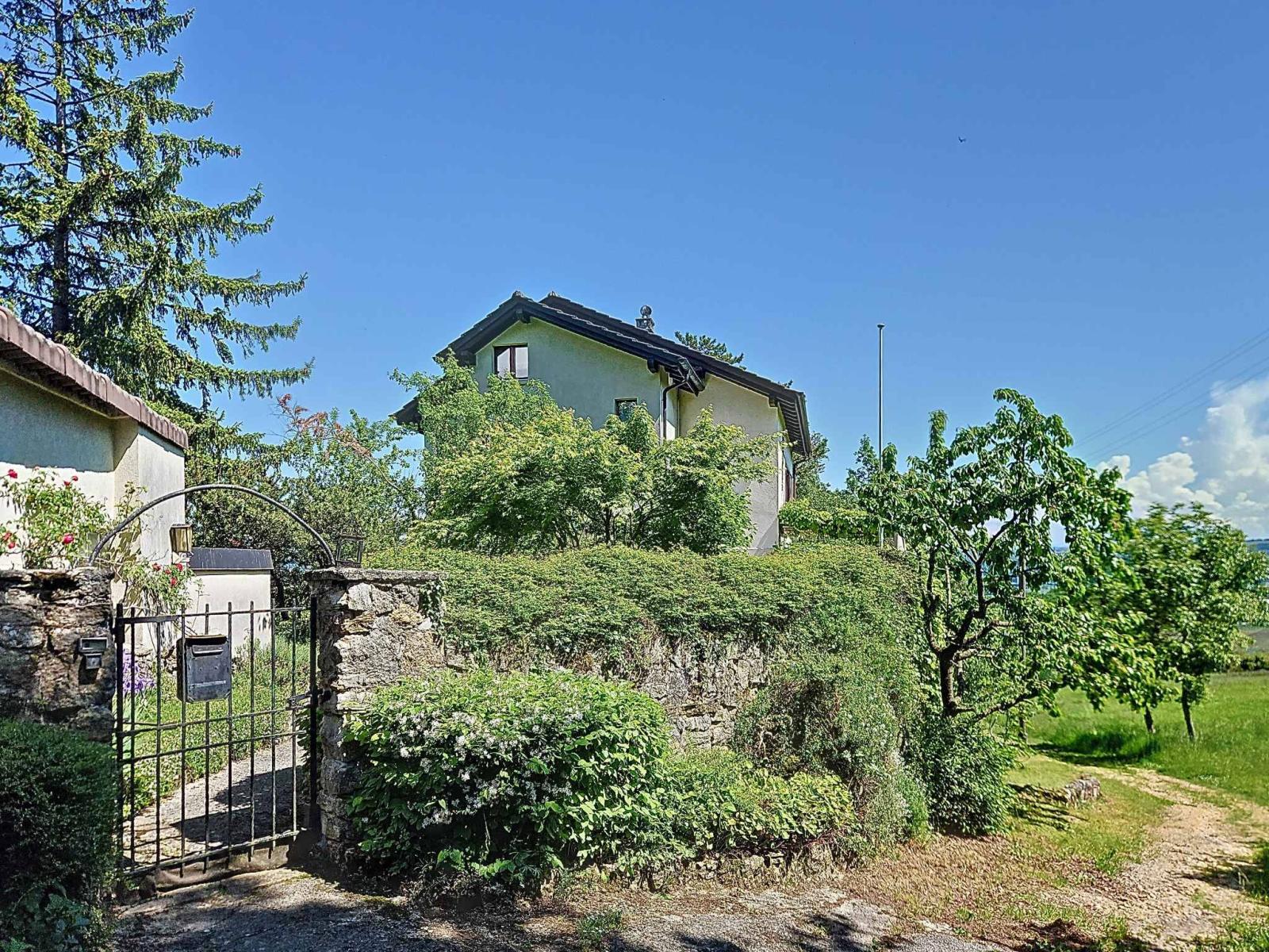 Située en position dominante sur une petite colline, la propriété bénéficie d’une vue panoramique remarquable sur le lac, la nature environnante, les montagnes et la ville d'Yverdon-les-Bains.