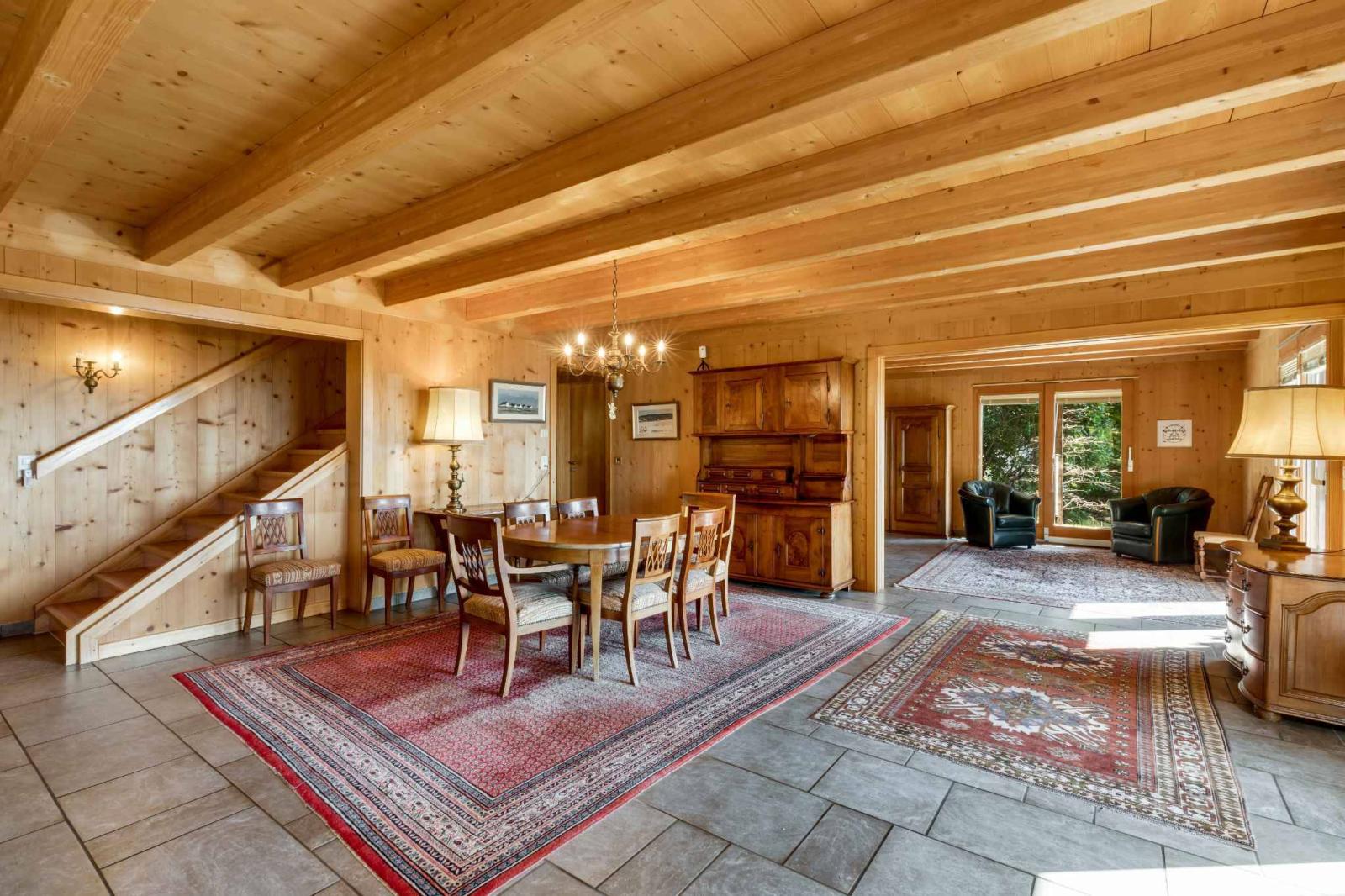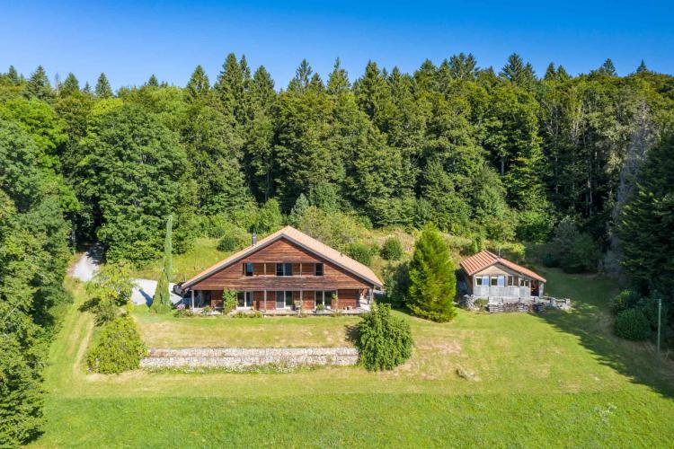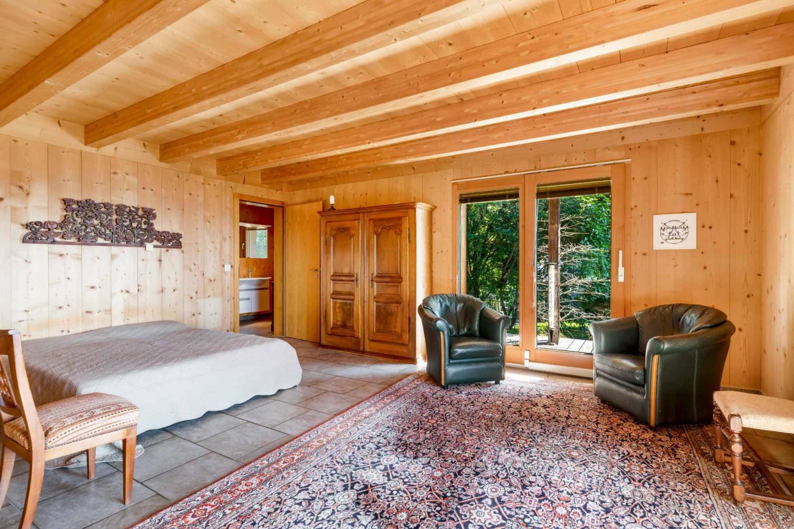L’ensemble se compose de deux chalets indépendants. Le chalet principal, construit en 2001 en bois massif, développe près de 230 m² habitables répartis sur deux niveaux et complétés par un sous-sol excavé. Son vaste séjour avec cheminée, sa cuisine équipée et ses espaces lumineux prolongés par une large terrasse en bois invitent à profiter pleinement du panorama. À l’étage, une grande pièce sous charpente peut être aménagée en plusieurs chambres selon les besoins.