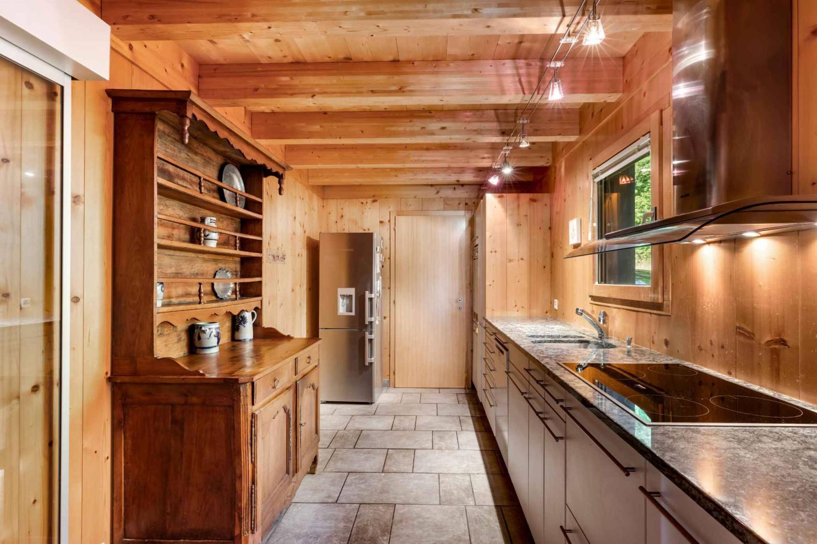 Le second chalet, datant de 1956 et rénové avec soin, propose environ 70 m² habitables. Accueillant et chaleureux, il dispose d’un séjour agrémenté d’un poêle suédois, d’une cuisine fonctionnelle, d’une chambre et d’une salle de bain moderne. Son sous-sol pratique permet d’entreposer matériel et équipements. Cet espace indépendant se prête idéalement à l’accueil d’invités, à la création d’un logement annexe ou à une mise en location.