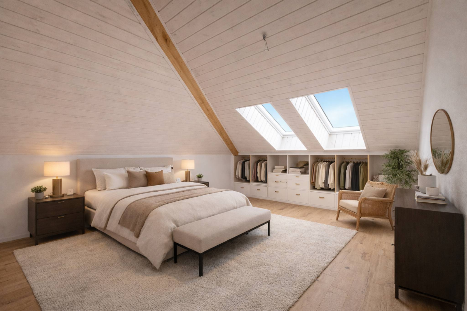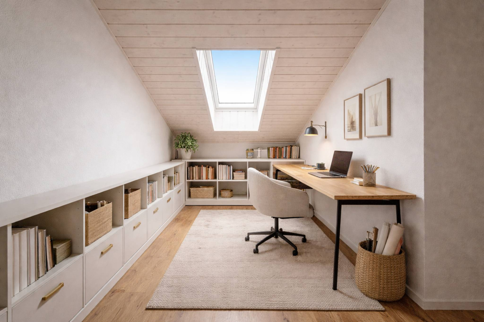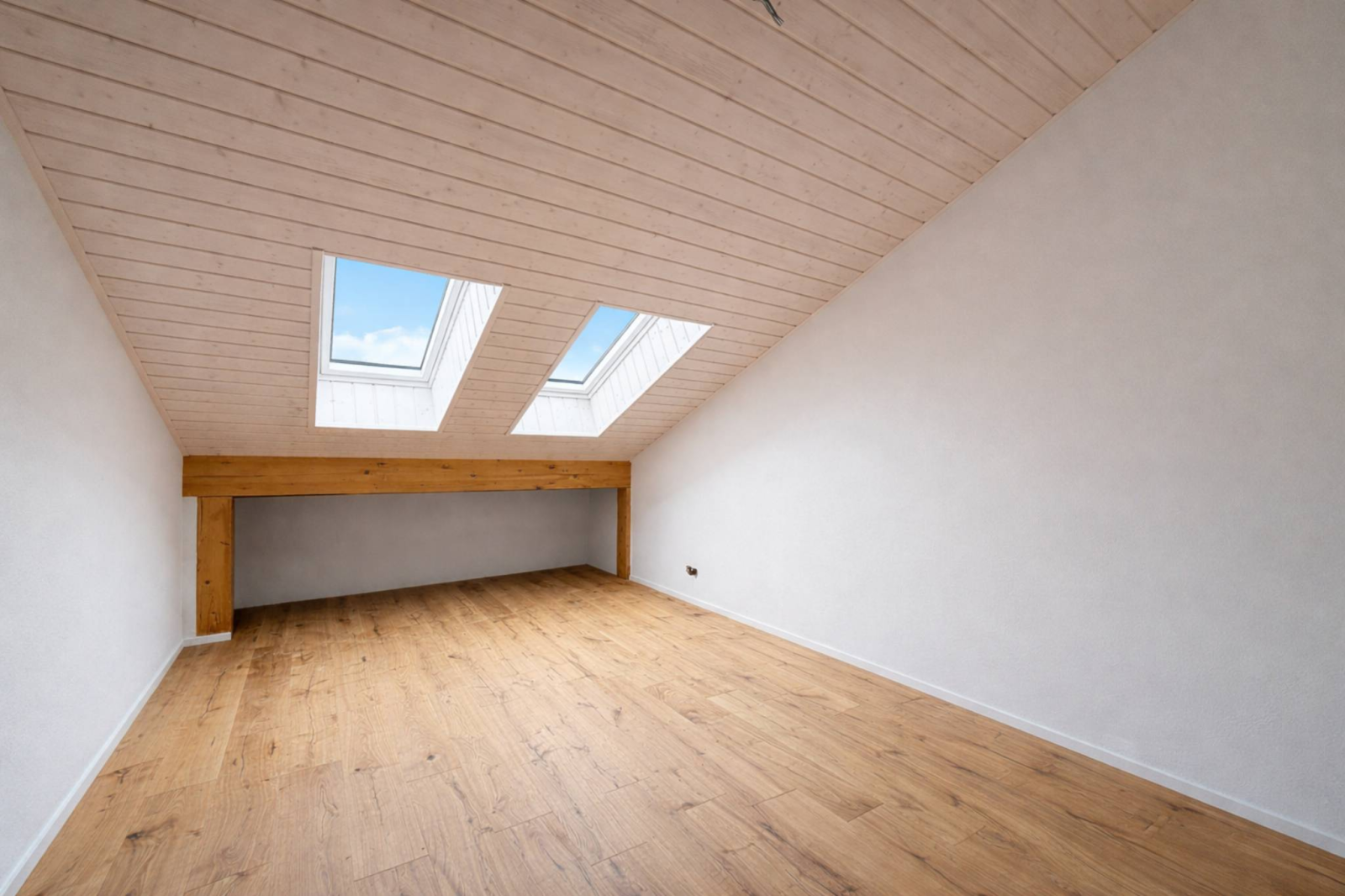 Les combles abritent deux chambres supplémentaires, une salle de bain avec baignoire ainsi qu’un espace de rangement/bureau. Les matériaux choisis témoignent d’un goût sûr et d’un réel souci de qualité : parquets chaleureux, carrelages grands formats, équipements durables.