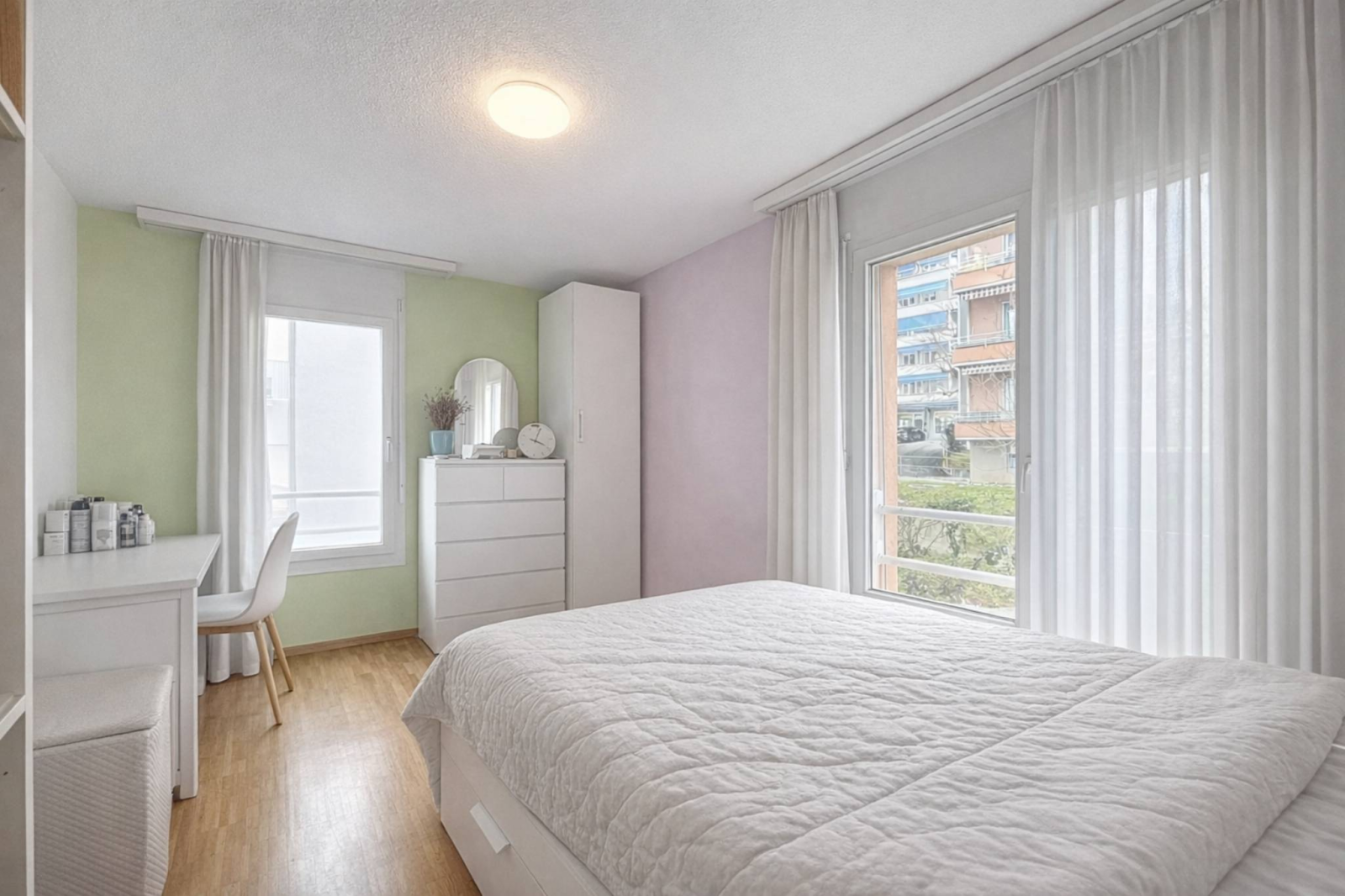 Implanté au 2ᵉ étage d’un petit immeuble en PPE, ce bien séduit par ses volumes généreux (surface habitable de ~110.6 m² et balcons de 18.8 m²) et sa distribution harmonieuse.