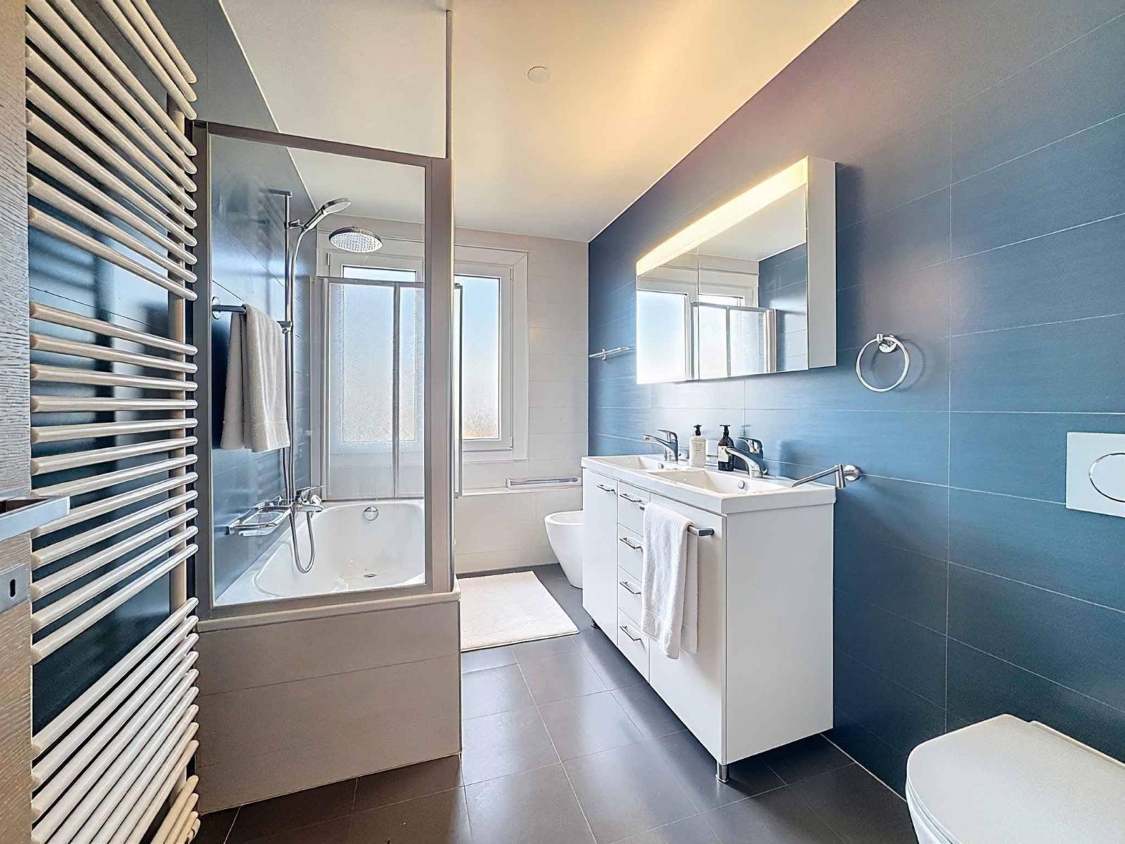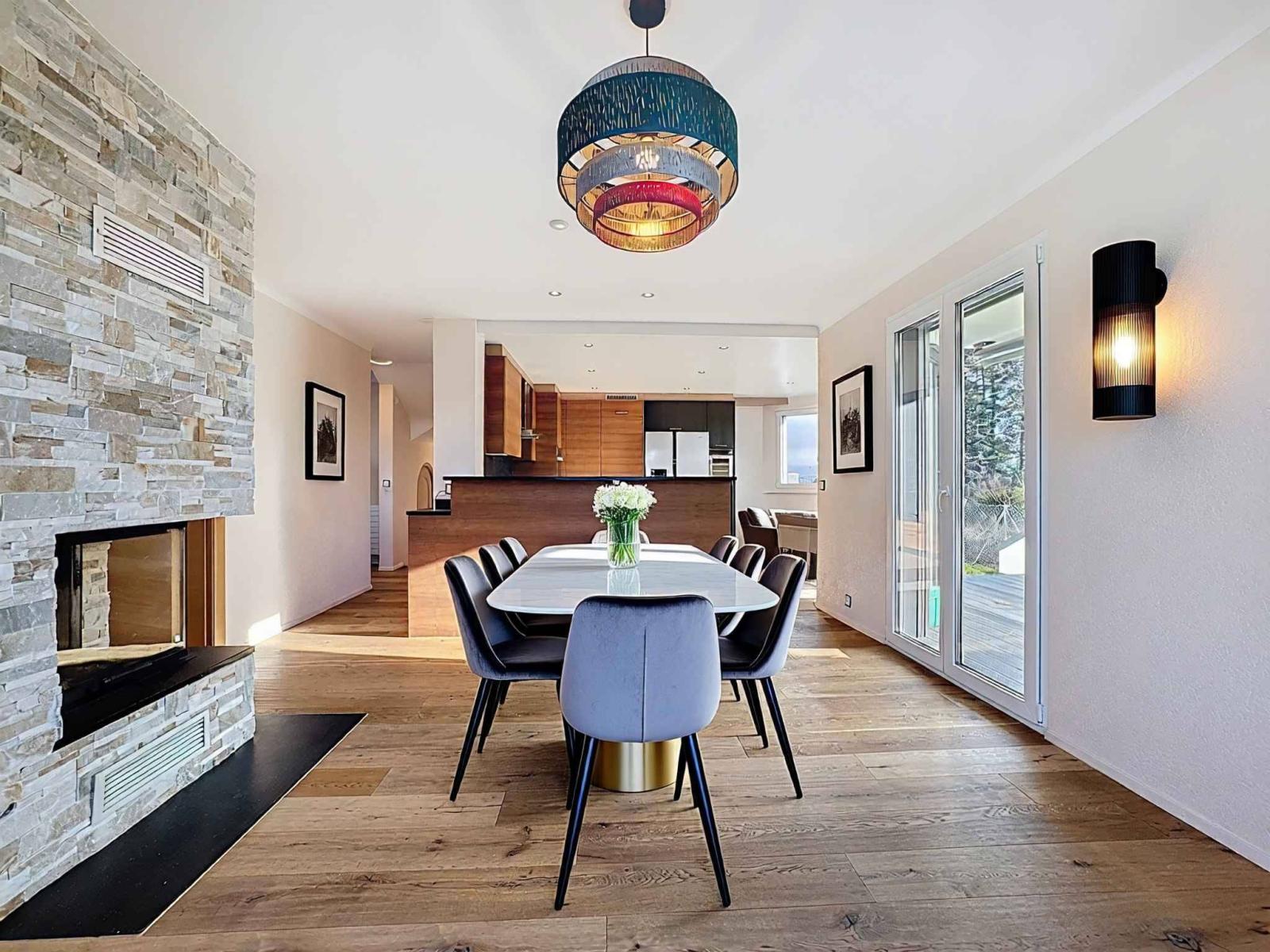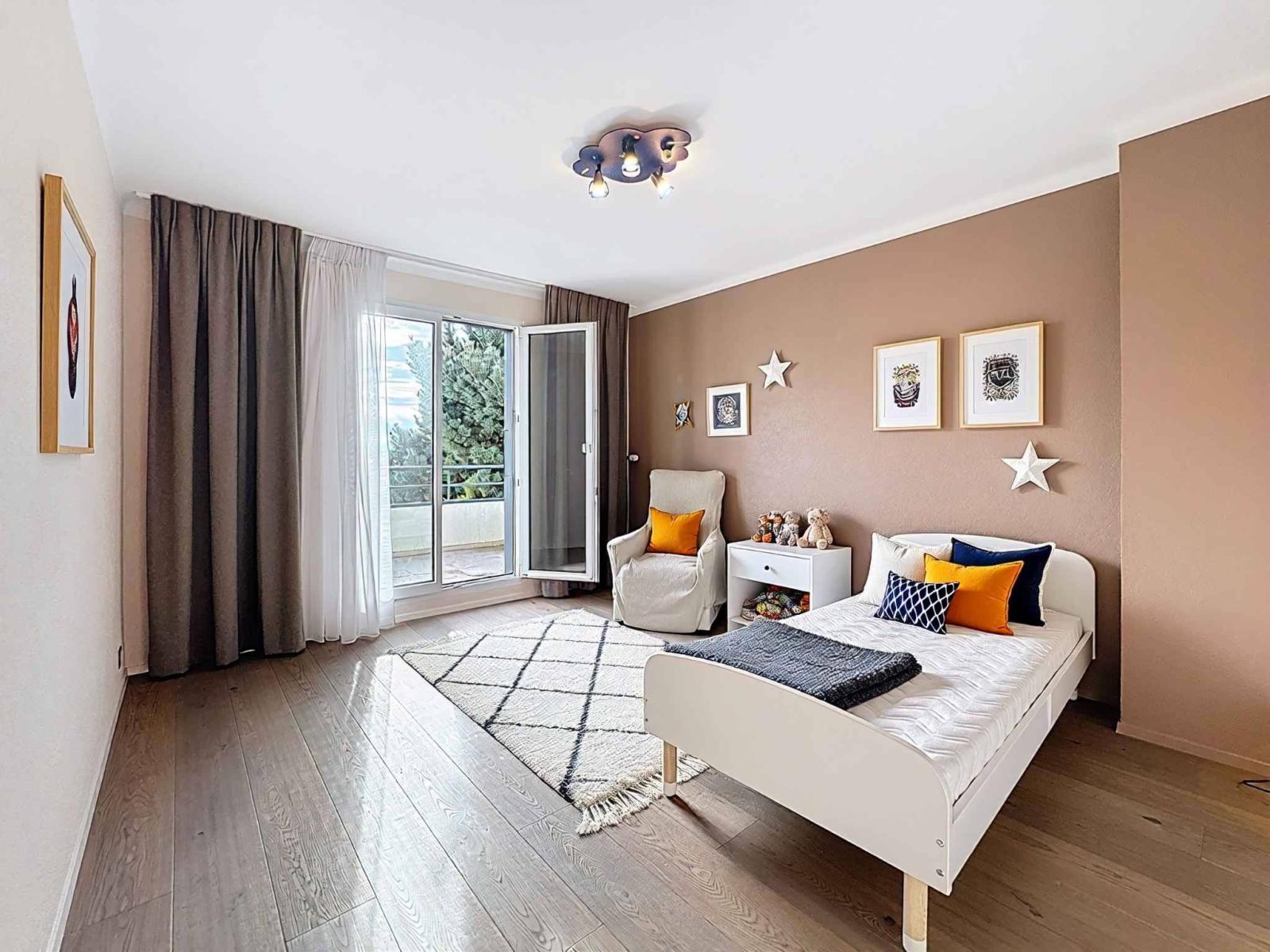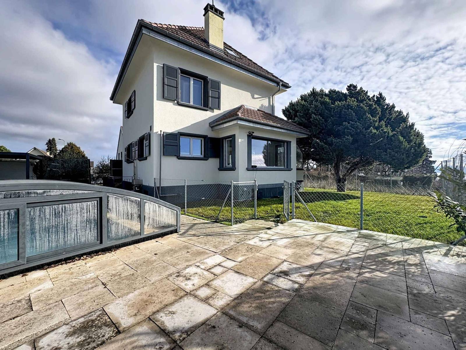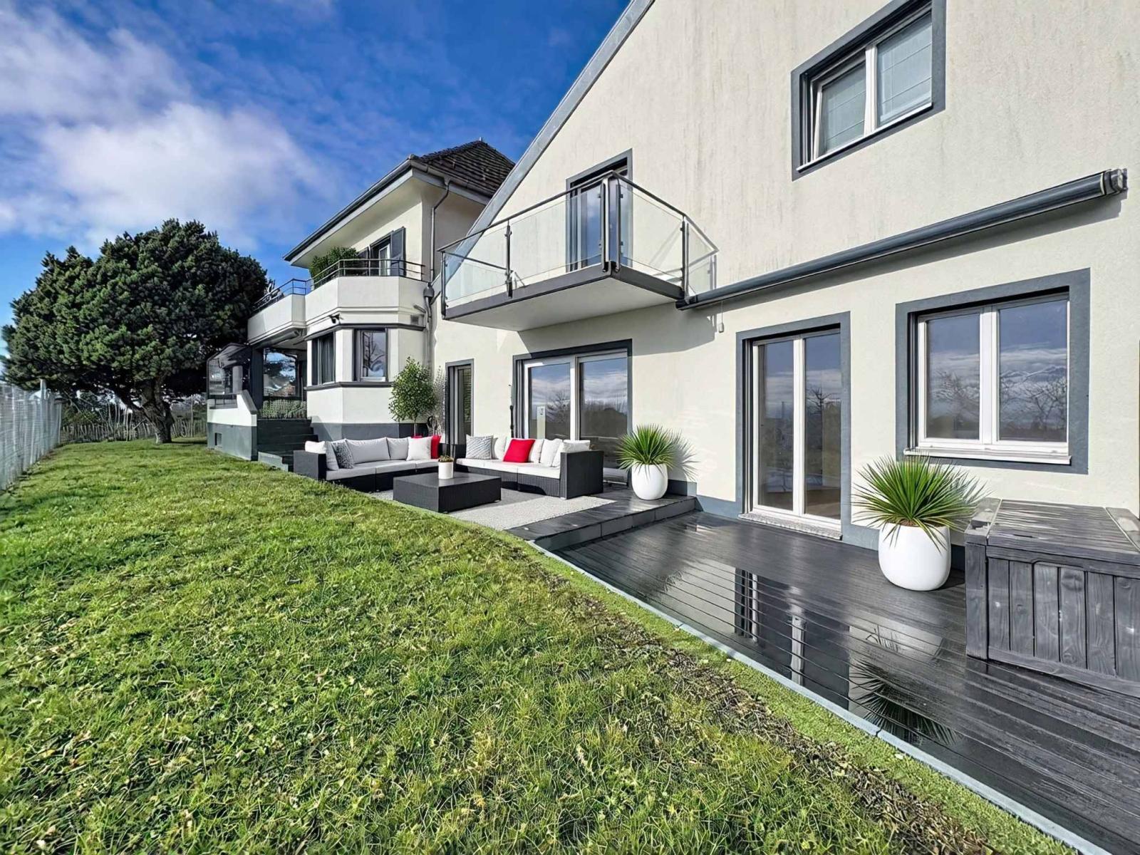 À l’extérieur, le charme opère pleinement : un joli terrain paysagé, un espace jardin propice à la quiétude, une terrasse ouverte sur l’horizon, et une piscine invitant à la détente, face à une vue sur le lac et les Alpes — un panorama vivant, changeant au fil des heures et des saisons.