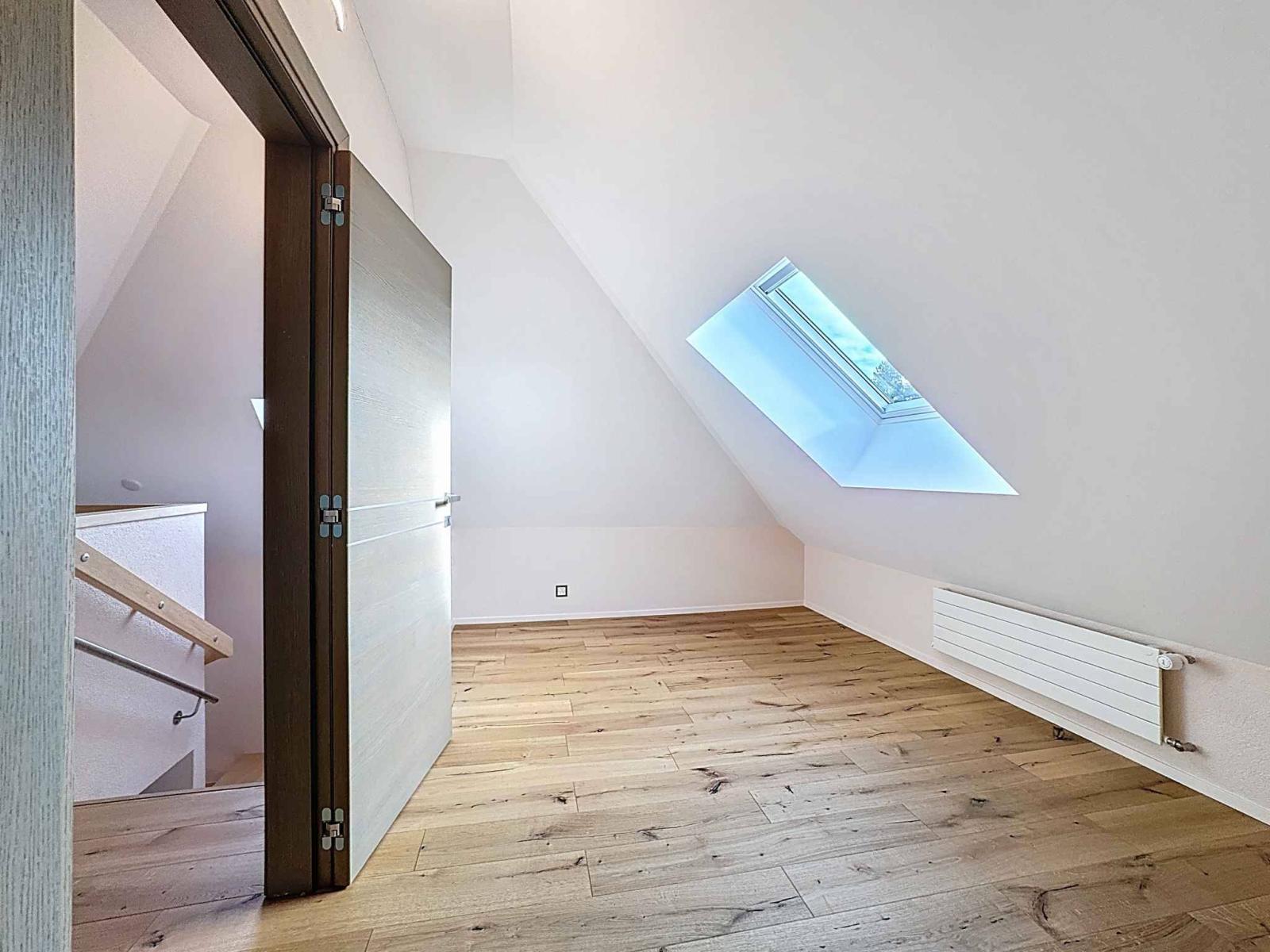 Sous les toits, le dernier étage révèle deux chambres généreuses sous combles, baignées d’une atmosphère douce et feutrée, idéales pour accueillir famille, invités ou, créer des différents espaces.
