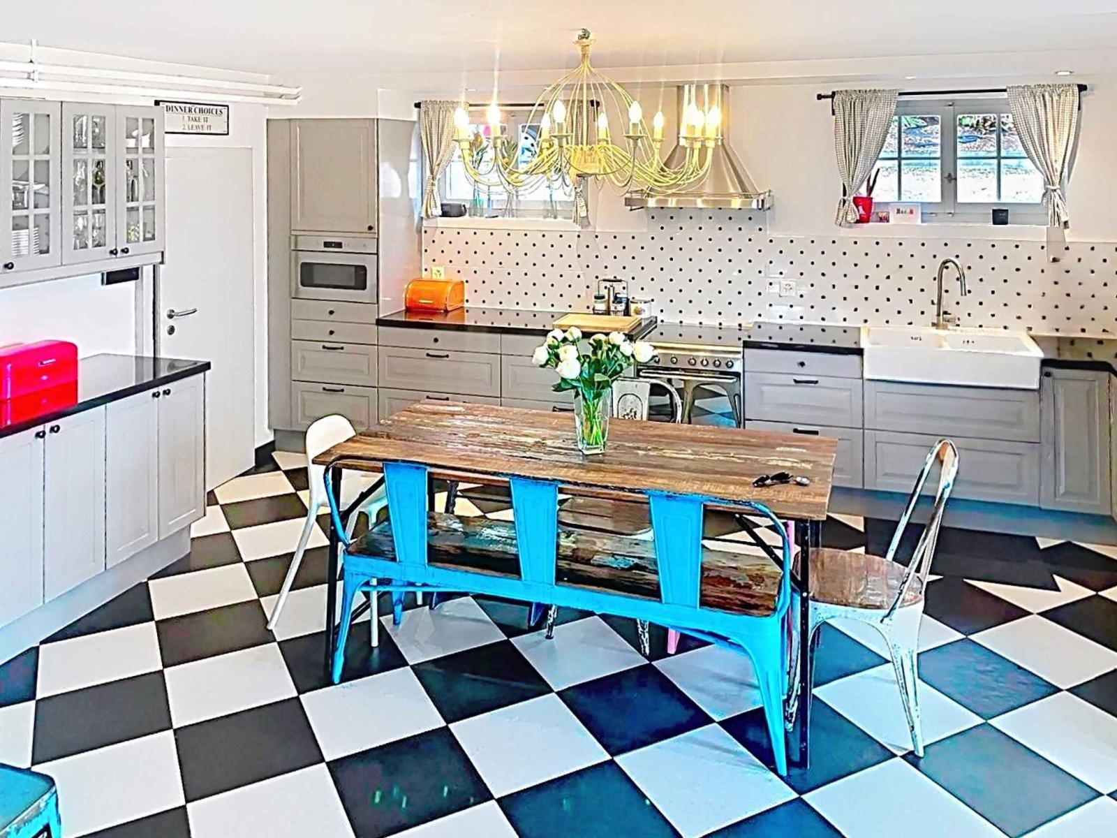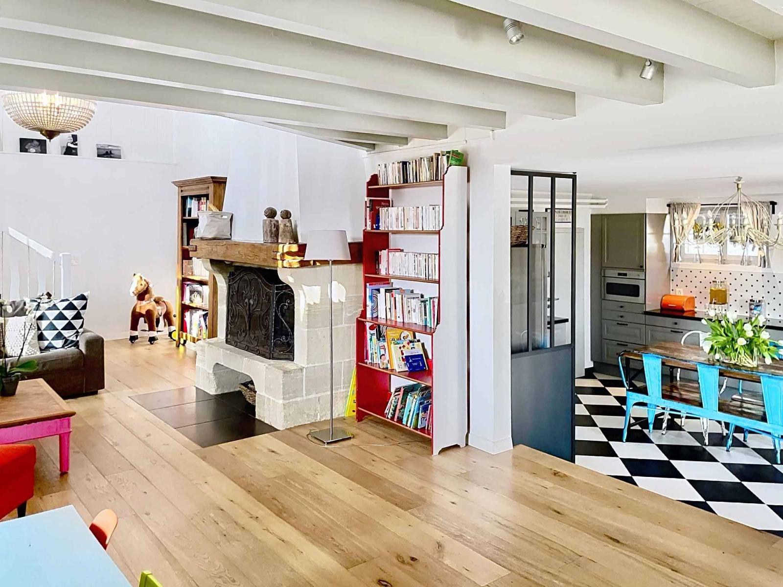 L'entrée se fait par la cuisine qui communique avec un vaste séjour, au plafond cathédrale, dont la cheminée centrale assure un charme supplémentaire. Sur ce niveau se trouvent également un bureau, une buanderie/local technique et les toilettes visiteurs.