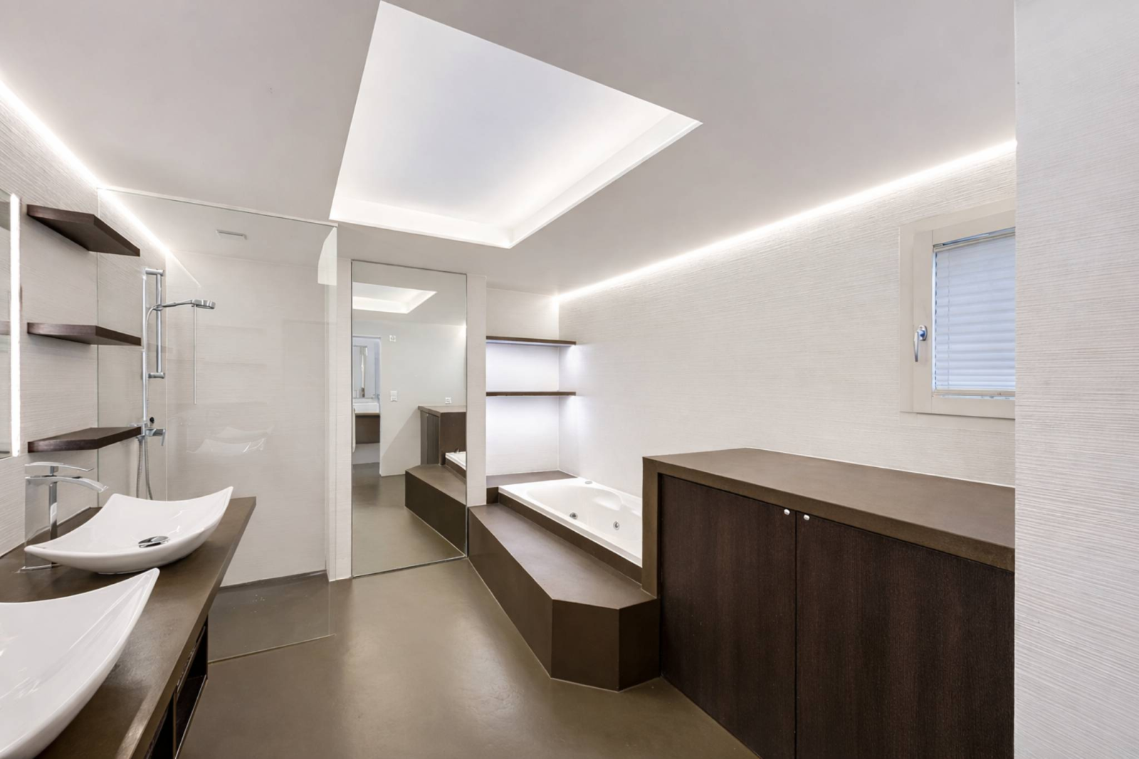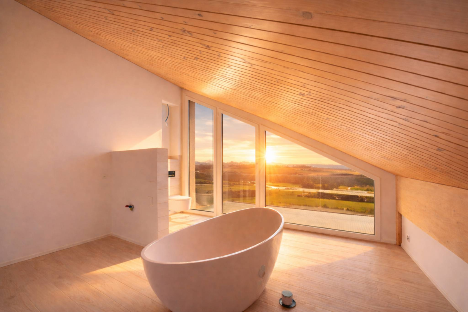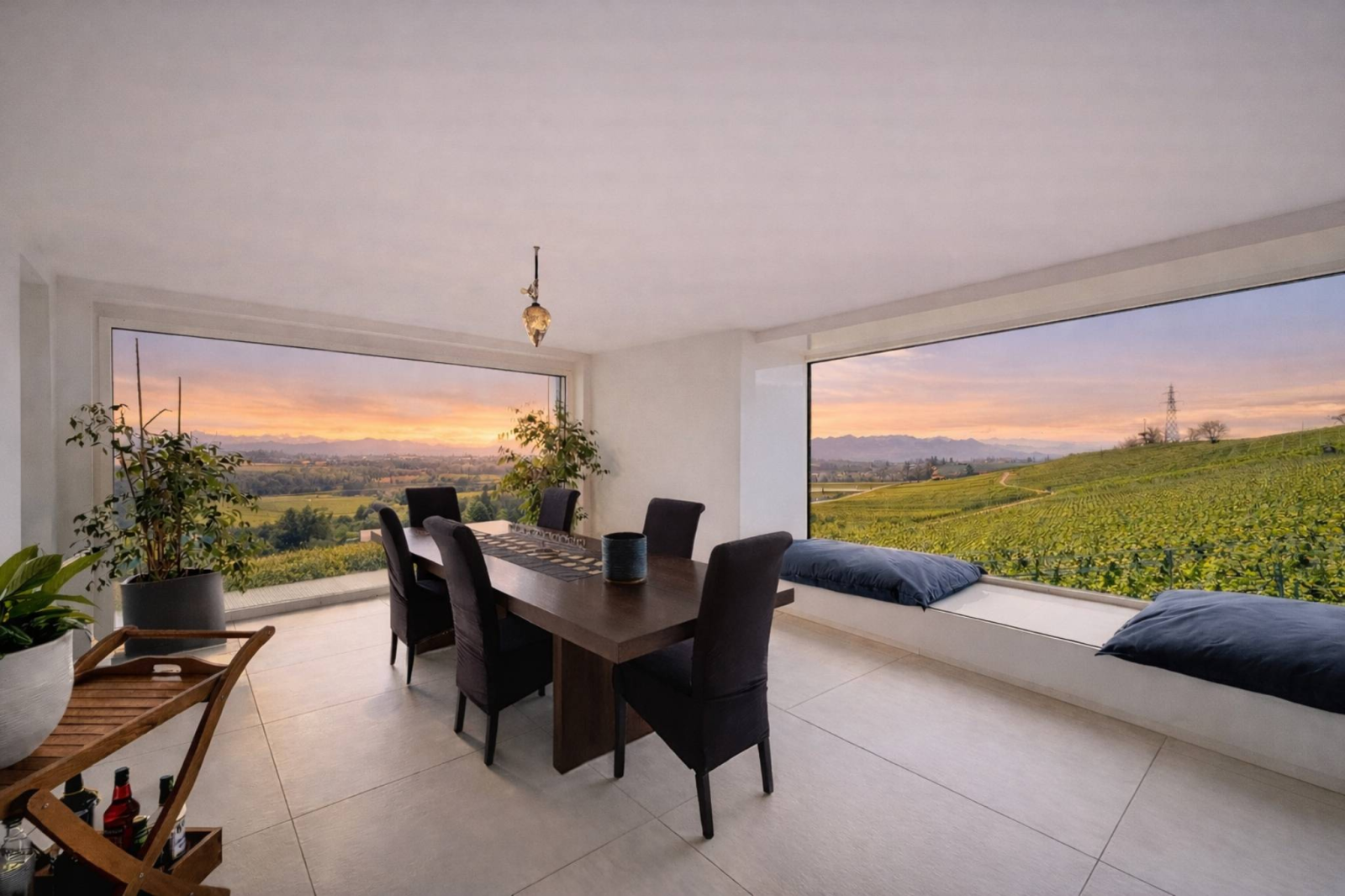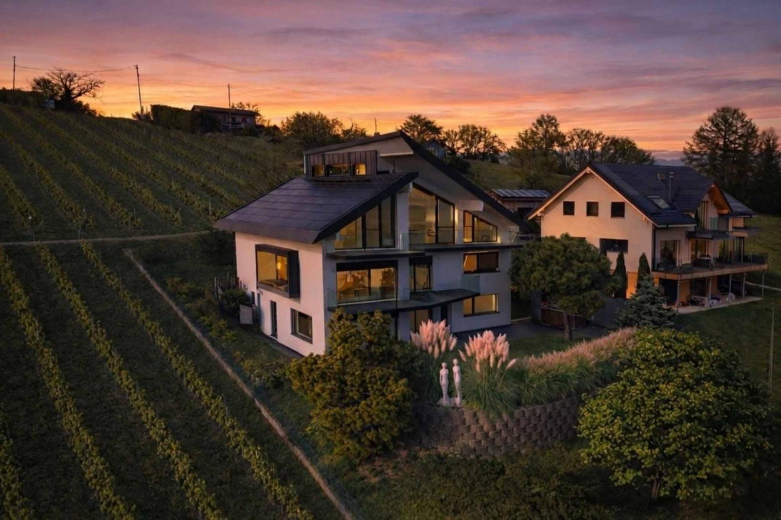 À l’est, les chambres captent les premières lueurs du jour. Le réveil se fait face aux reliefs alpins, dans une atmosphère douce et silencieuse. Au sud, le séjour s’ouvre par de vastes baies vitrées semblant flotter au-dessus des ceps. La vue est magistrale. Le regard embrasse le Léman de Villeneuve à Genève, glisse sur les Alpes et s’arrête sur la silhouette du Mont-Blanc. Un panorama vivant, changeant, presque irréel.
