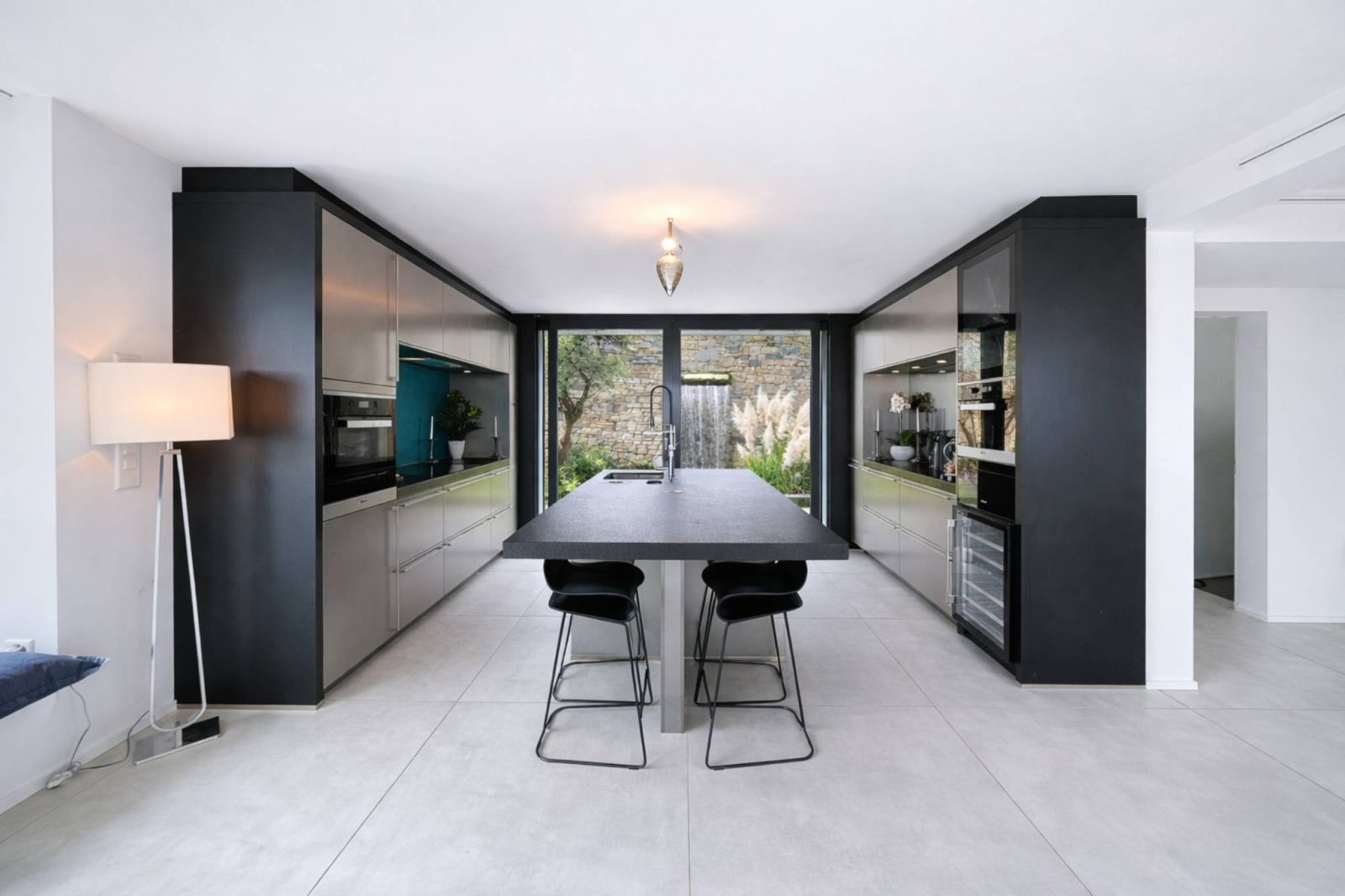 À l’extérieur, l’atmosphère évoque les grandes propriétés viticoles. Sous les cinq places de stationnement, d’importants volumes de rangement ont été intégrés avec discrétion. Au pied d’un olivier centenaire, l’espace avait été conçu pour accueillir réceptions et dégustations, dans une ambiance confidentielle, face aux vignes.