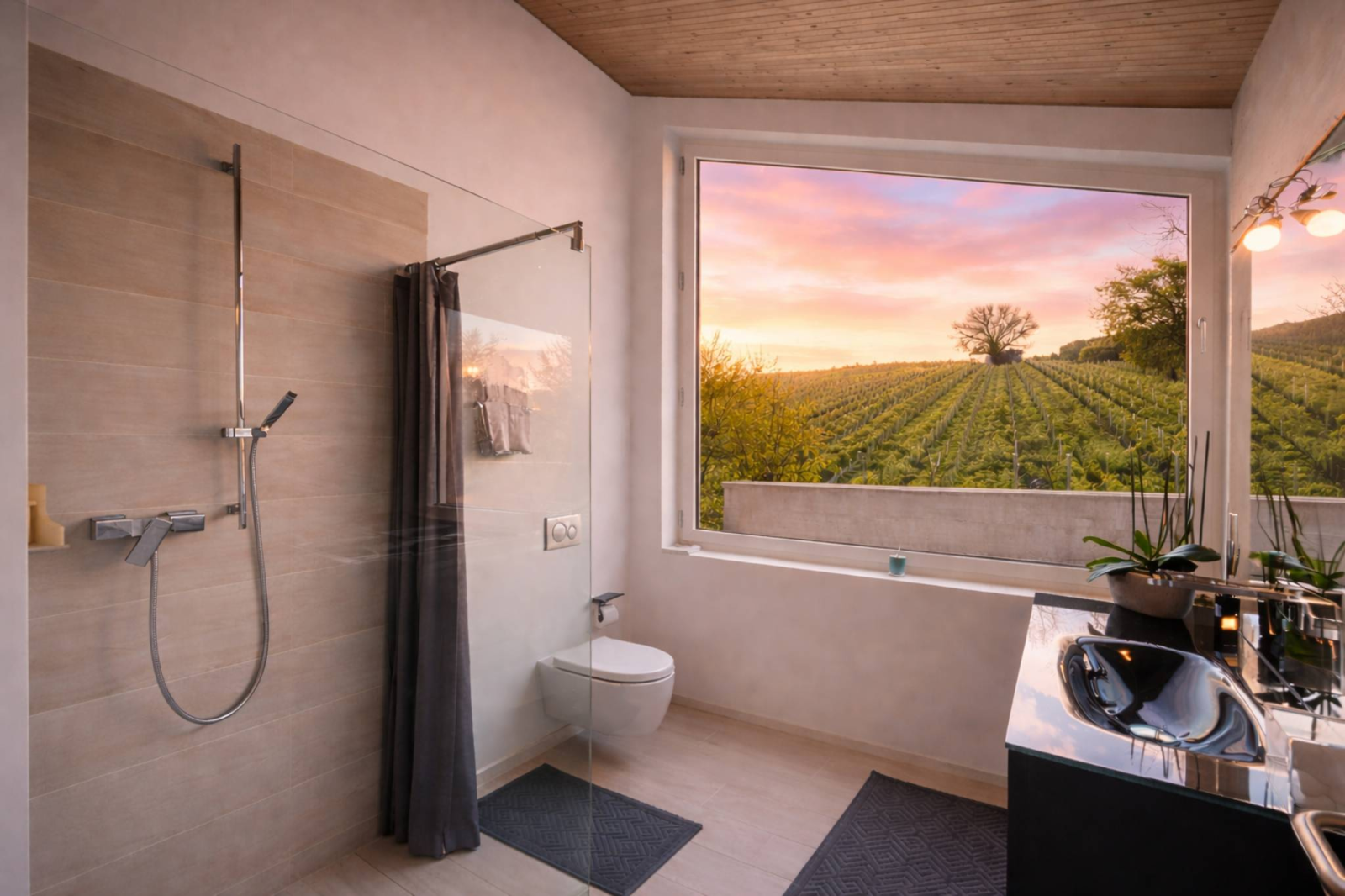 L’annexe indépendante prolonge l’esprit du lieu. Elle abrite un sauna entièrement vitré, ouvert sur les vignes, accompagné d’une douche à l’italienne. Cet espace peut évoluer vers un véritable univers bien-être : spa privé, salle de fitness, ou seconde zone détente.