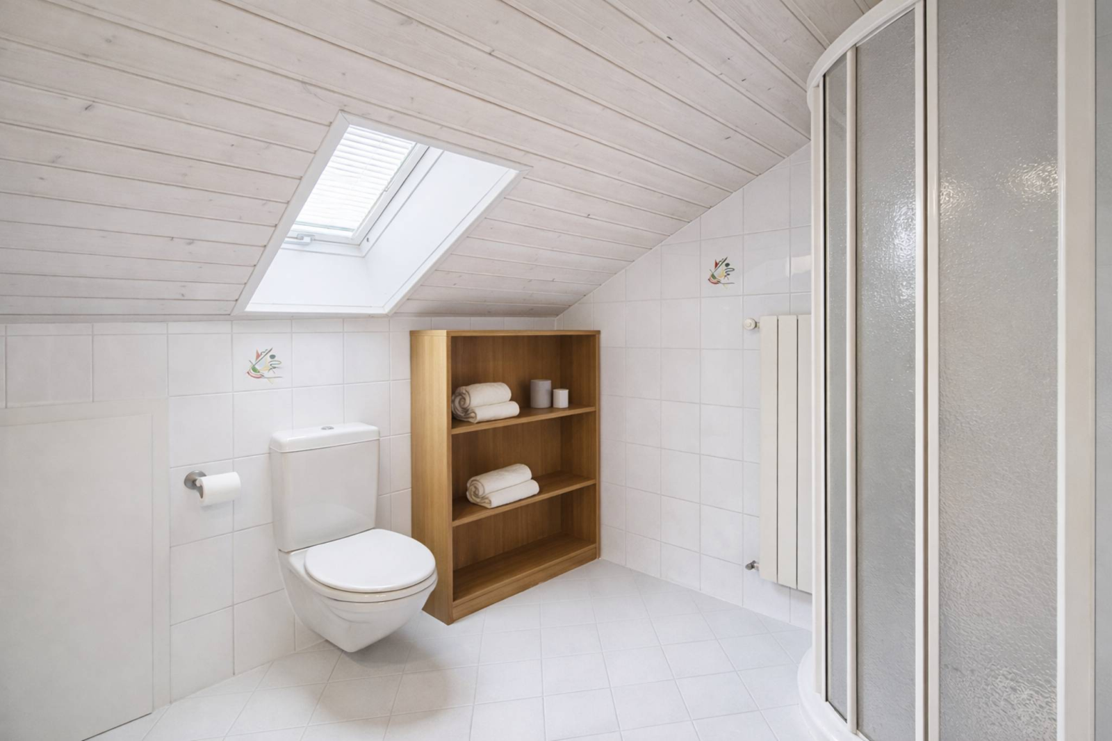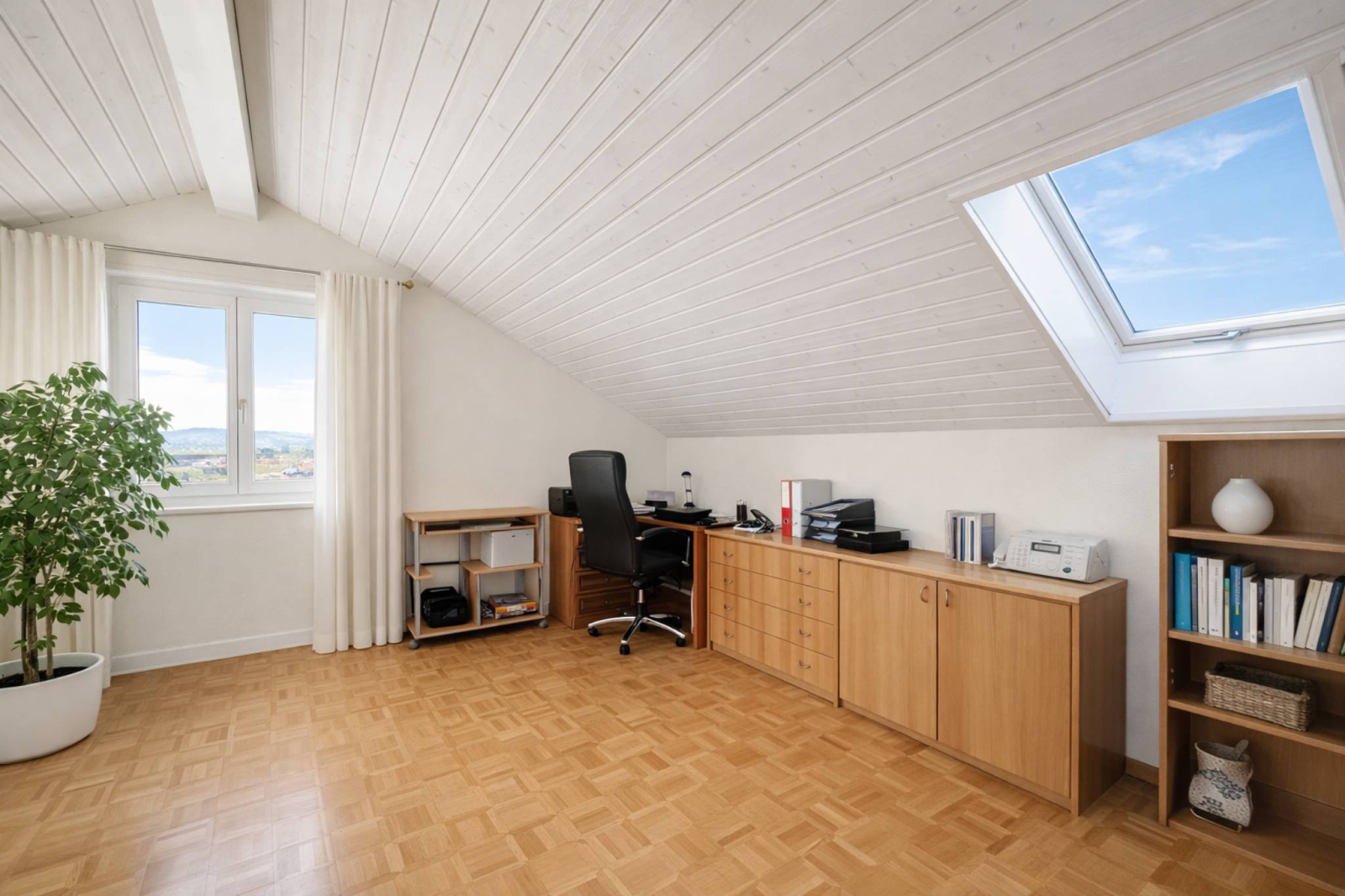 L’étage propose une mezzanine, un grand espace bureau, une chambre, une salle de douche avec WC ainsi qu’un espace annexe avec local technique.