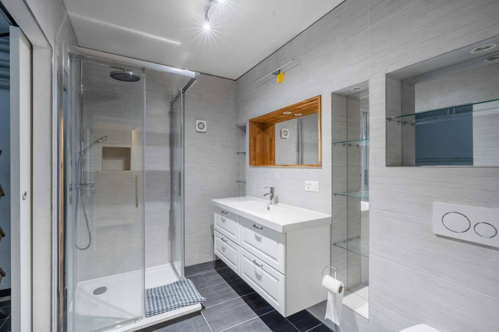 Le niveau inférieur dispose d’une seconde salle de bains avec douche ainsi que d’une buanderie privative, apportant un confort appréciable au quotidien.
