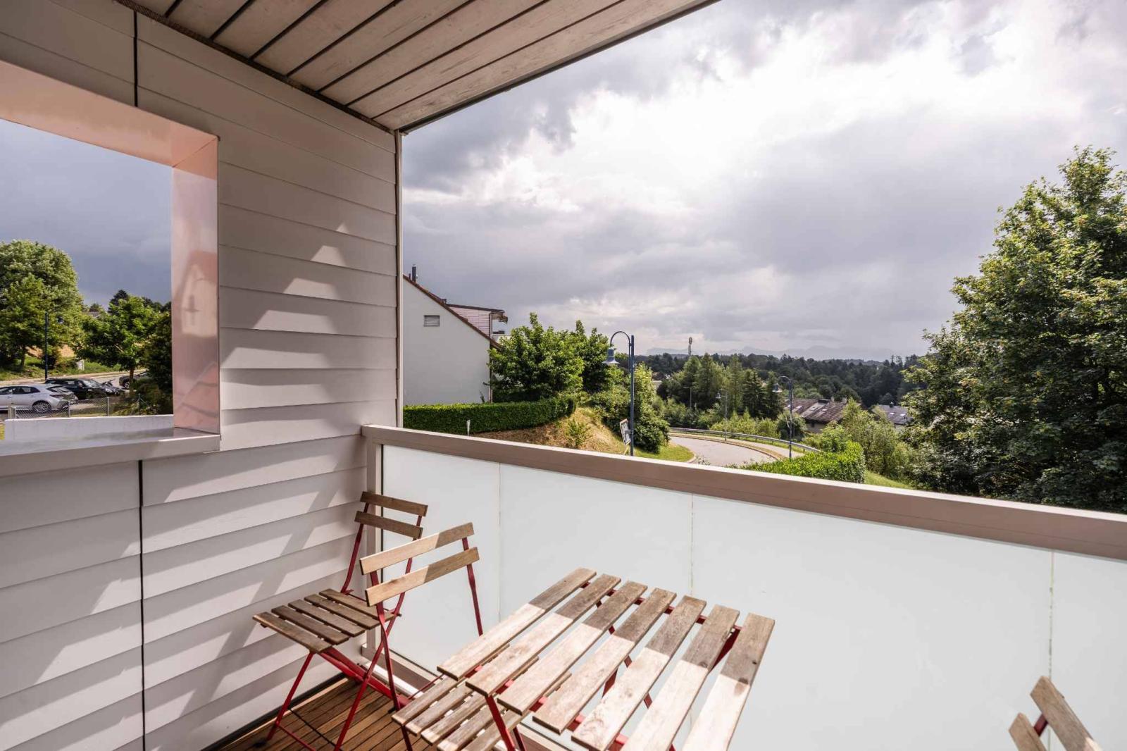 L’espace de vie principal se compose d’un séjour lumineux ouvert sur une cuisine entièrement équipée. L’ensemble crée un lieu convivial et agréable à vivre, prolongé par un balcon permettant de profiter d’un extérieur orienté vers un environnement verdoyant.