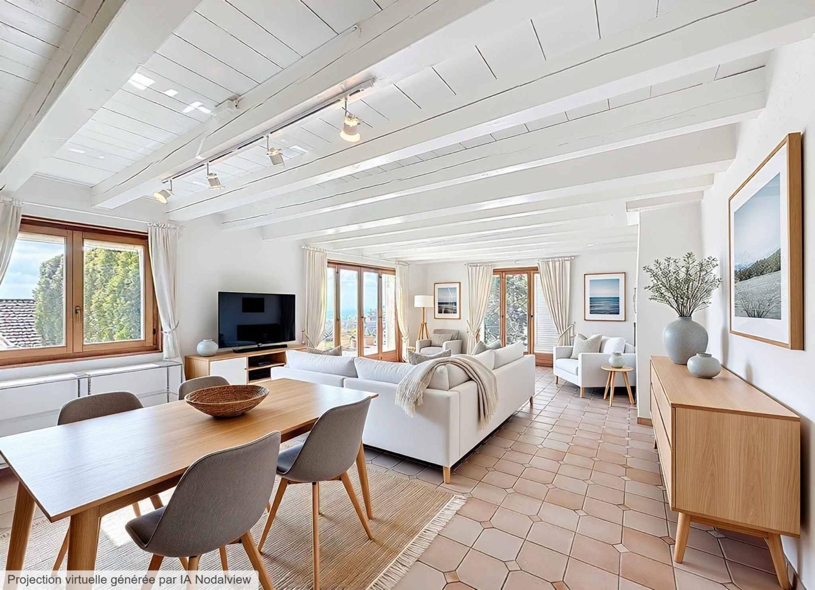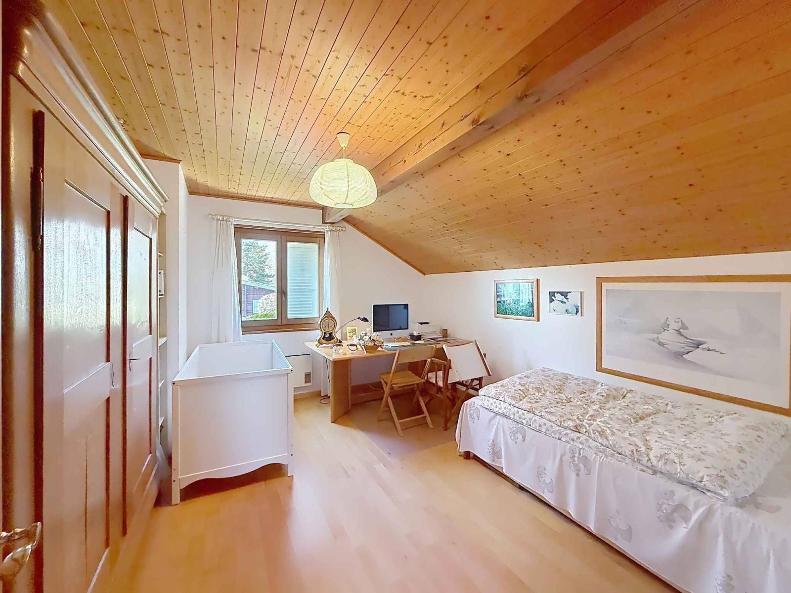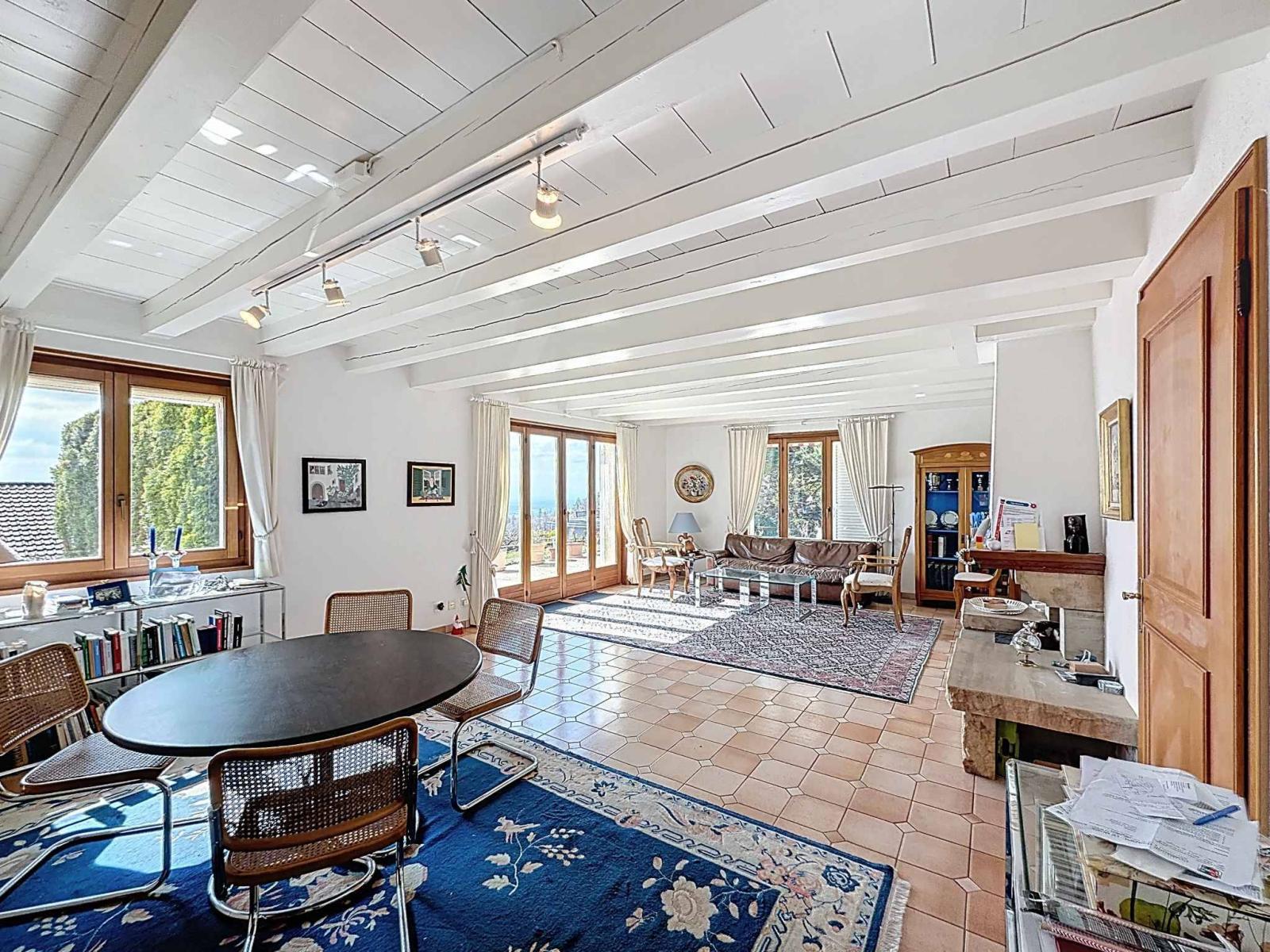 Construite sur une parcelle de 1001 m2, cette villa d'environ 150m2 habitables est entourée d'un grand jardin arboré et offre une superbe vue sur le lac et les Alpes.