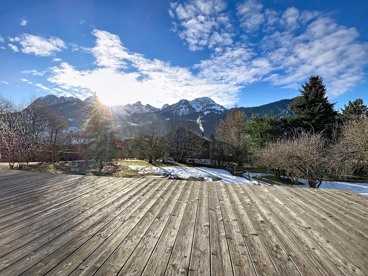 Située légèrement au-dessus du village, cette propriété bénéficie d'une vue dégagée sur les environs. Un vaste jardin s'étend devant le chalet, offrant un bel espace extérieur.
