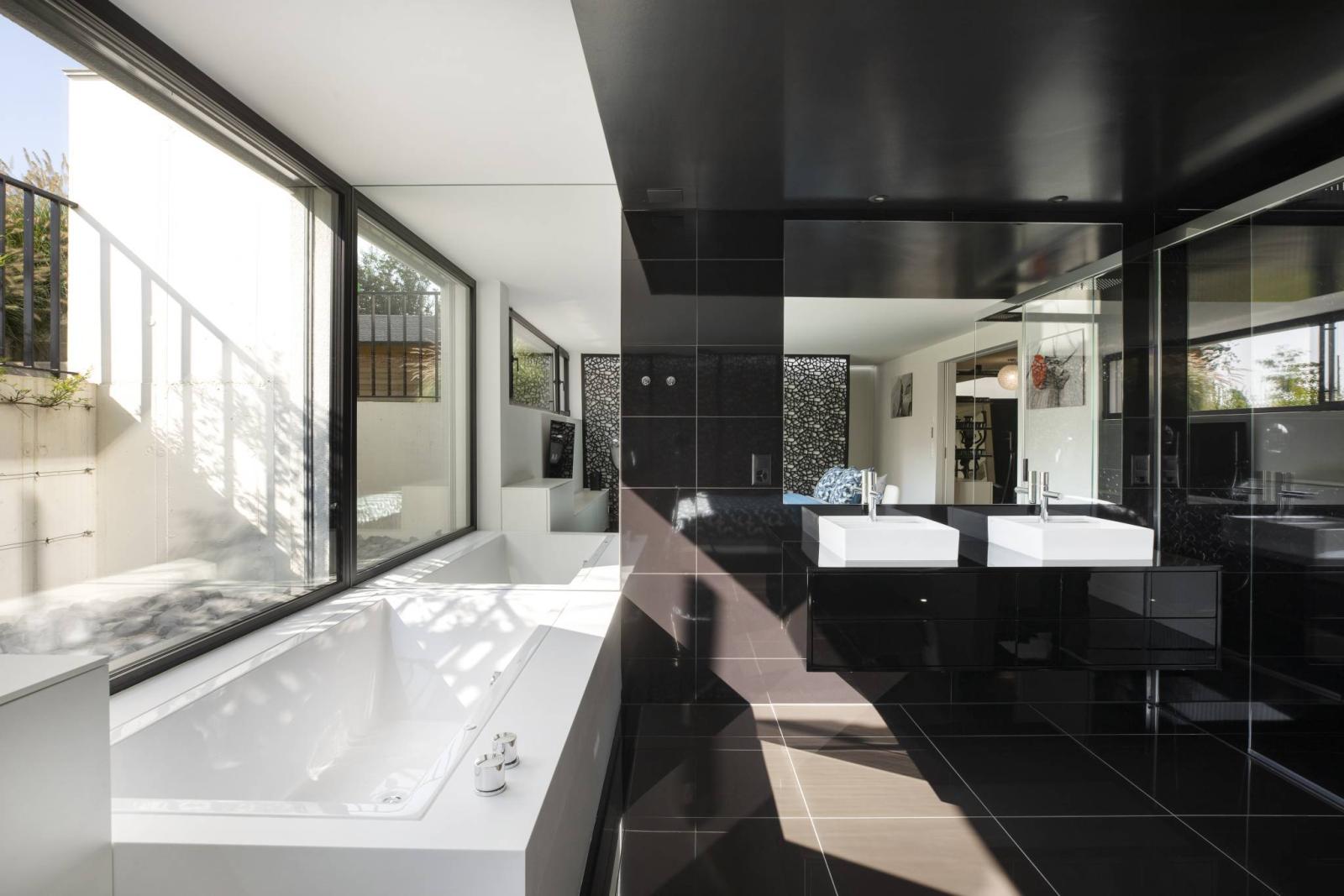 Le rez inférieur bénéficie d’une grande suite parentale avec sa salle de bains (douche et jaccuzzi), de deux dressings, d’un bureau avec rangements, d’un fitness et de plusieurs espaces polyvalents, d’une salle de douche avec toilettes, d’un abri PC / buanderie.