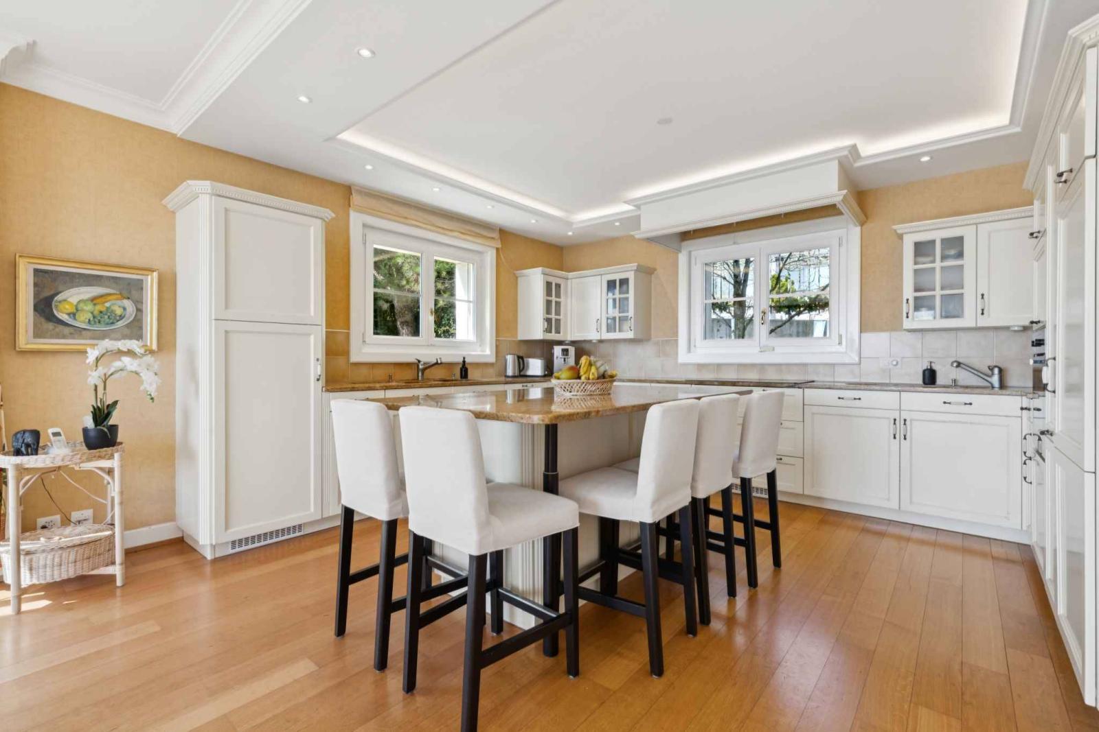 À l’extérieur, le jardin soigneusement aménagé constitue un véritable havre de paix, agrémenté d’une piscine et de plusieurs espaces de détente, dans un écrin de verdure préservé. Un garage pouvant accueillir trois véhicules ainsi que plusieurs places de parc extérieures viennent compléter avantageusement ce bien d’exception.