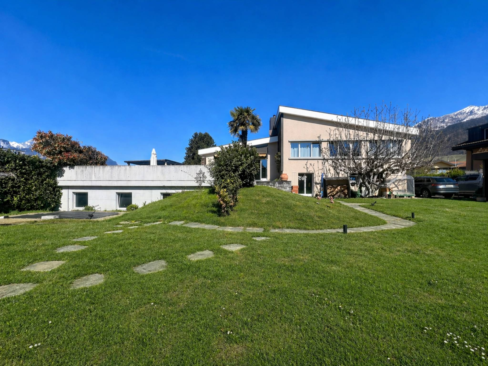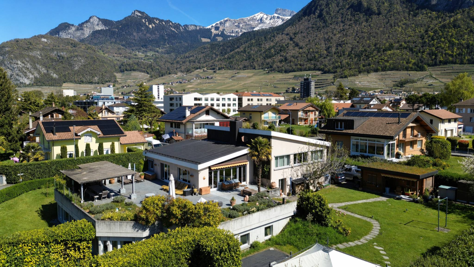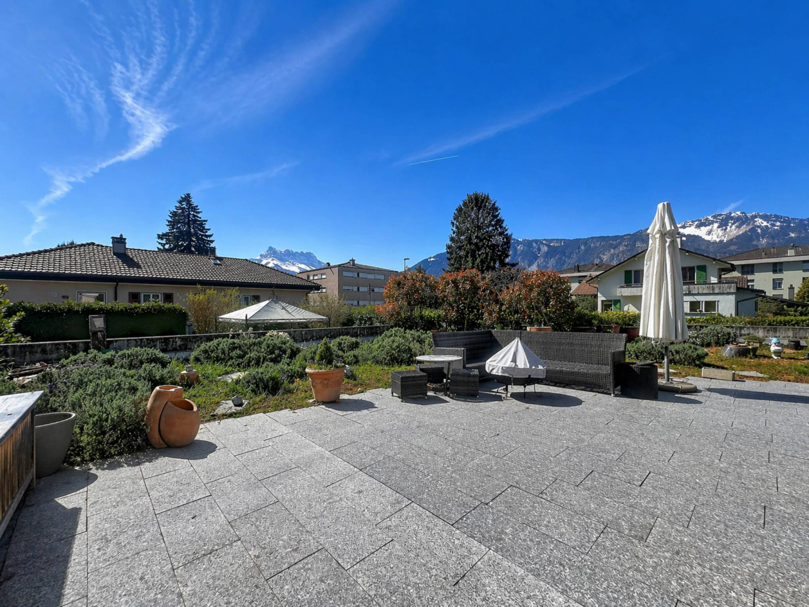 Bénéficiant d’une exposition plein sud, la propriété profite d’une vue imprenable sur les Dents du Midi. Son jardin, joliment arboré et entièrement clôturé, constitue un cadre idéal pour des moments de détente en famille ou entre amis.