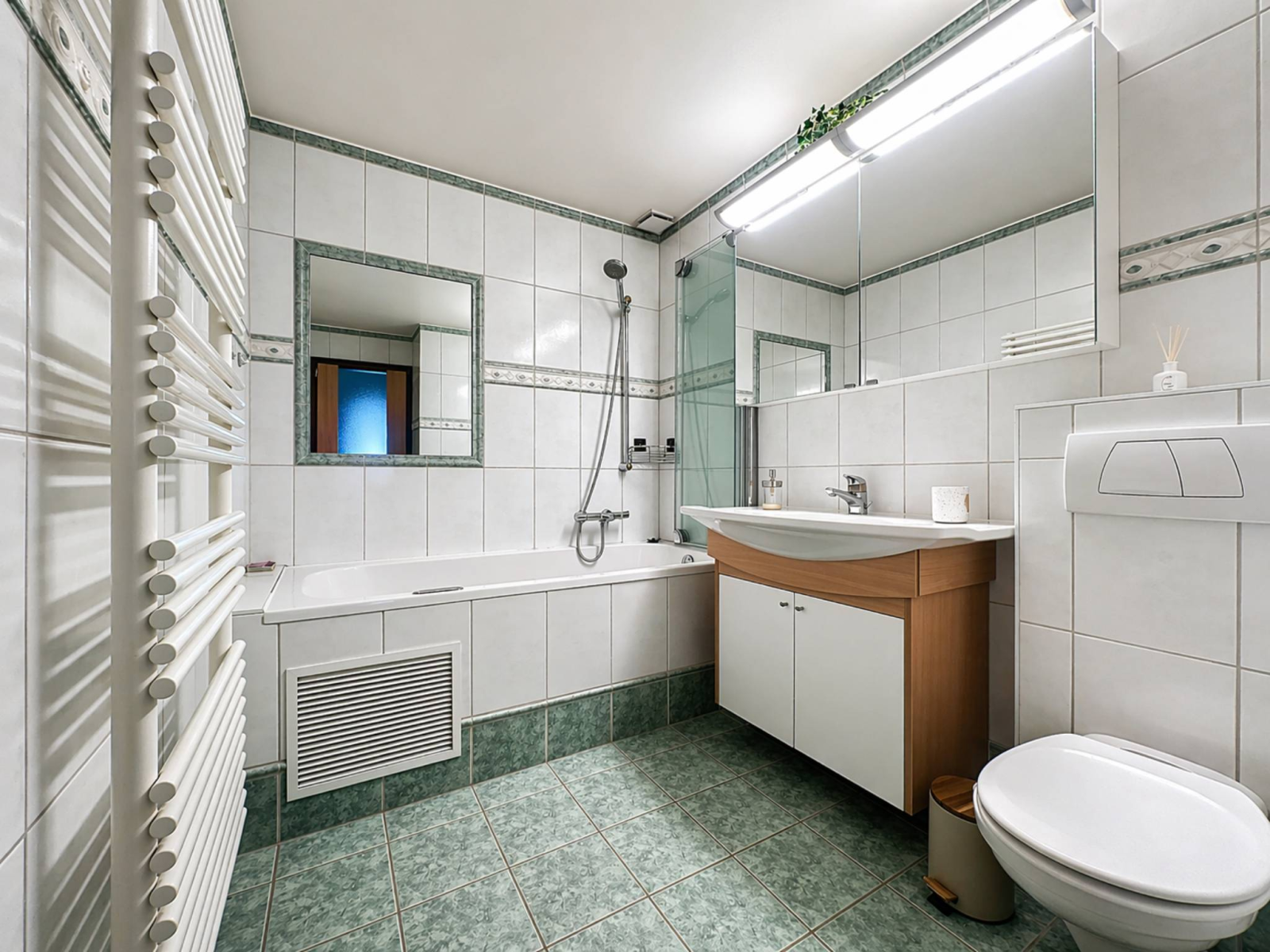 Un hall avec armoires murales, cinq chambres spacieuses, une salle de bains avec WC ainsi qu’une salle de douche avec WC.