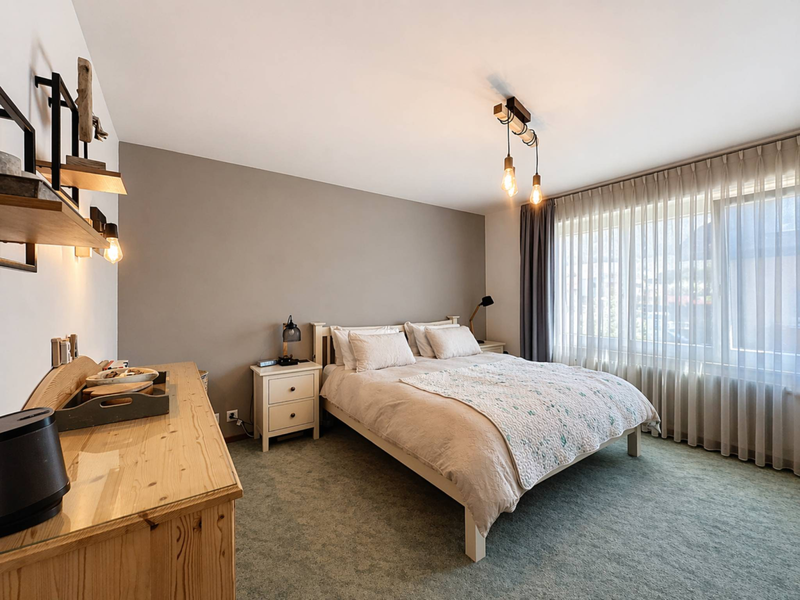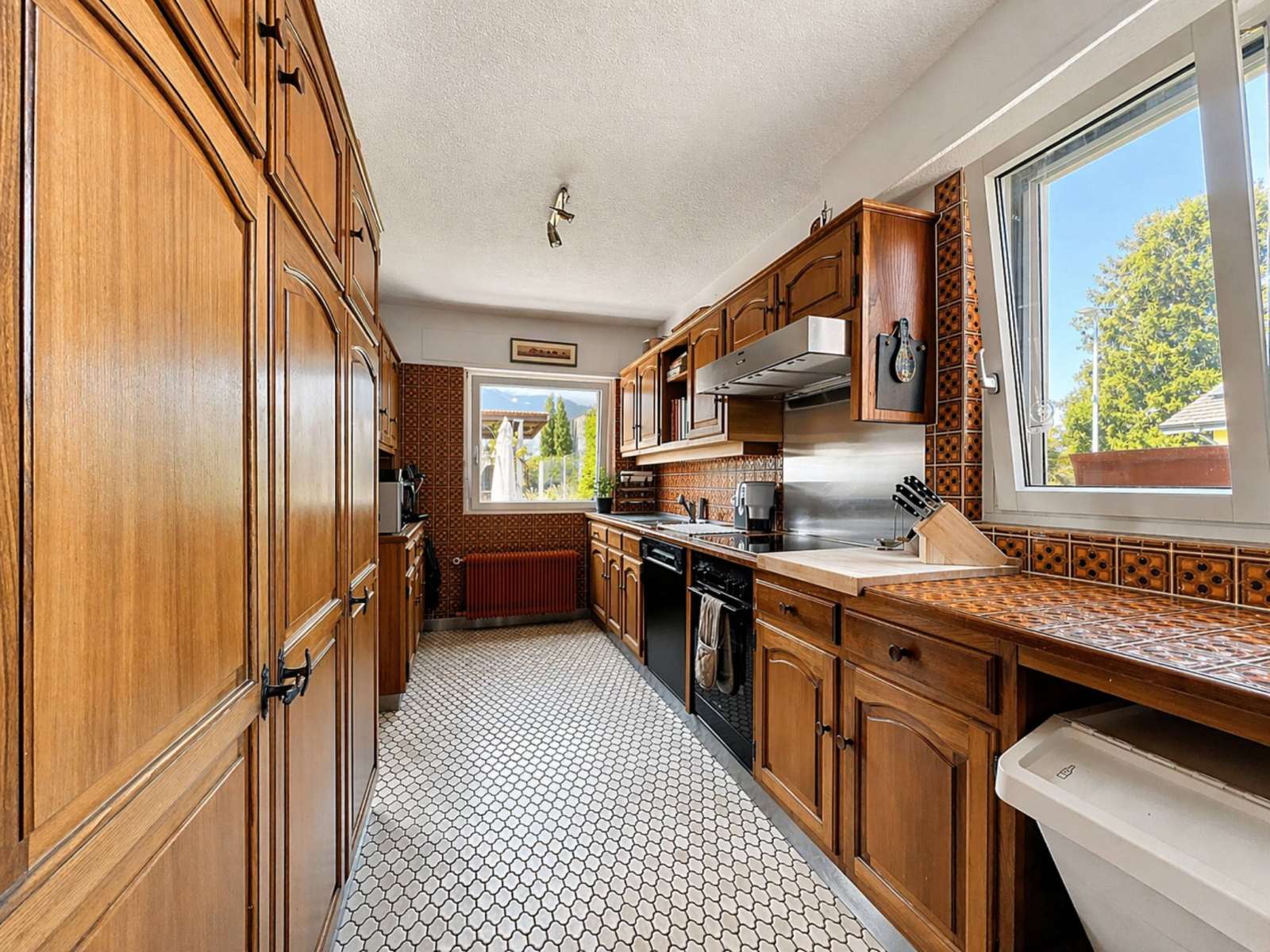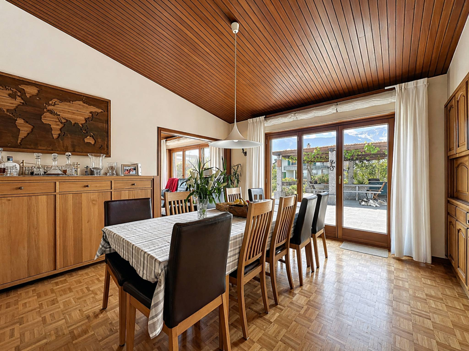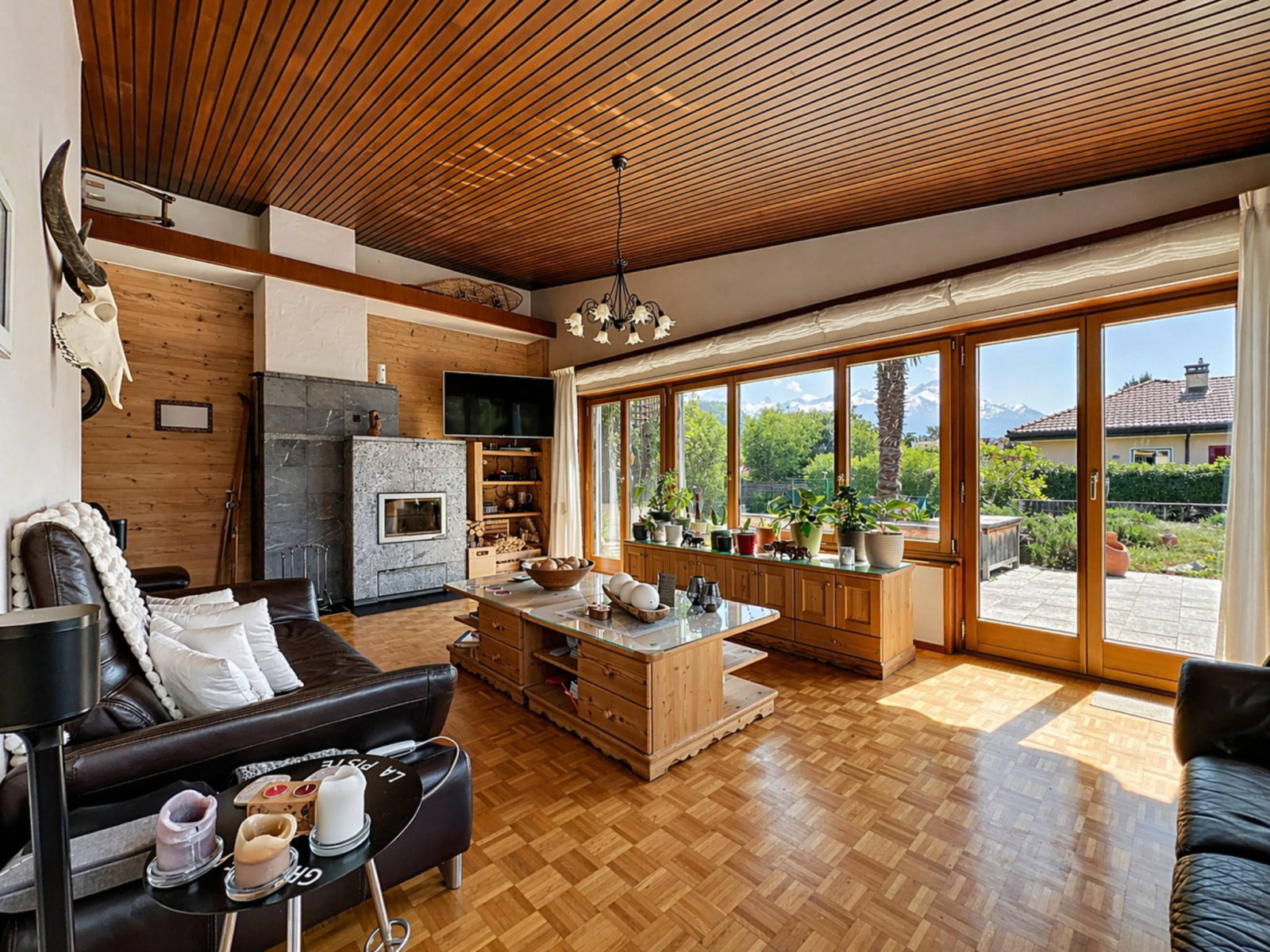 Un grand hall d’entrée avec penderie, une cuisine indépendante entièrement équipée, une salle à manger, ainsi qu’un spacieux séjour avec poêle à bois donnant accès à une grande terrasse, dont une partie est couverte par une pergola.