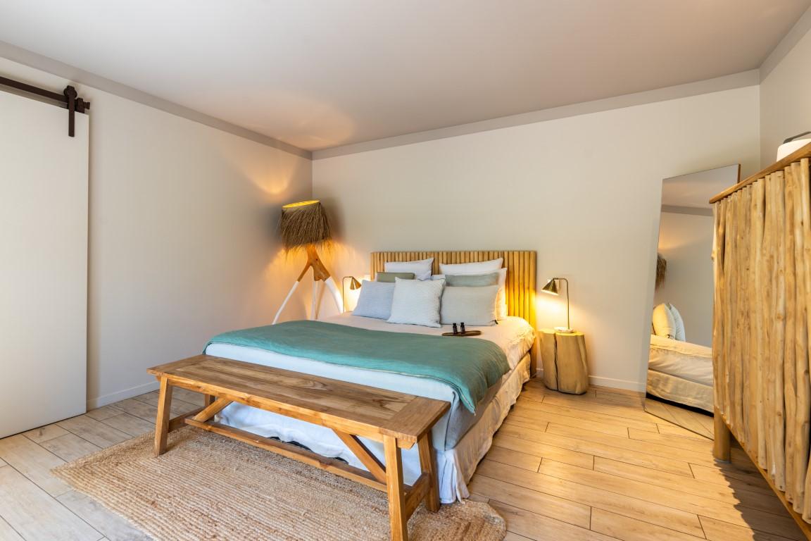À l’extérieur, tout a été pensé pour créer des espaces de détente et de convivialité : une piscine à débordement s’ouvre sur le paysage environnant, complétée par une douche extérieure, un bar, une cuisine équipée et un espace restauration propice aux moments partagés ou aux événements privés.
