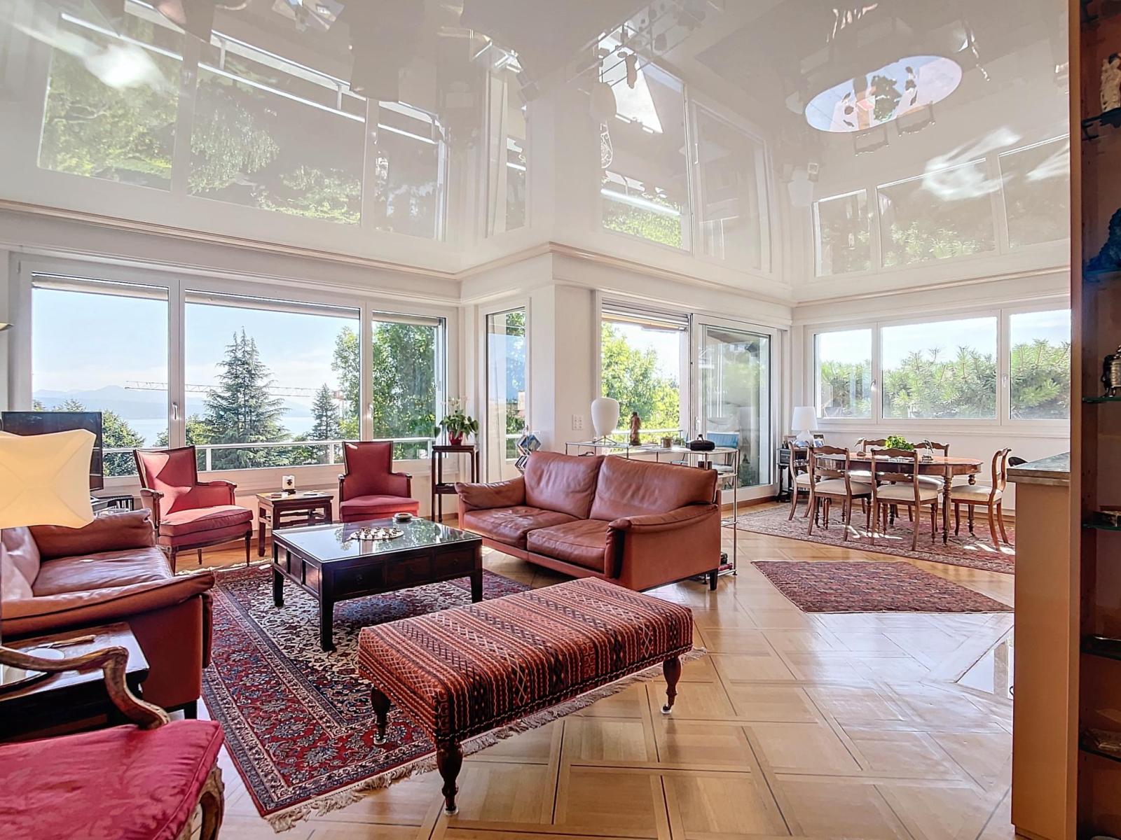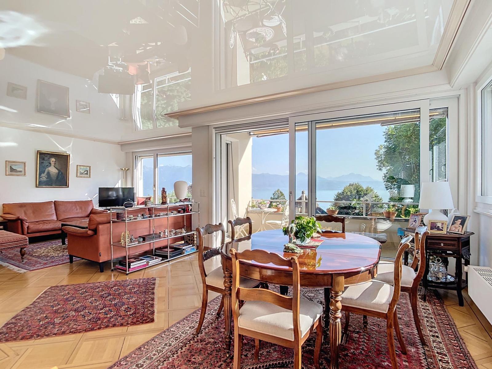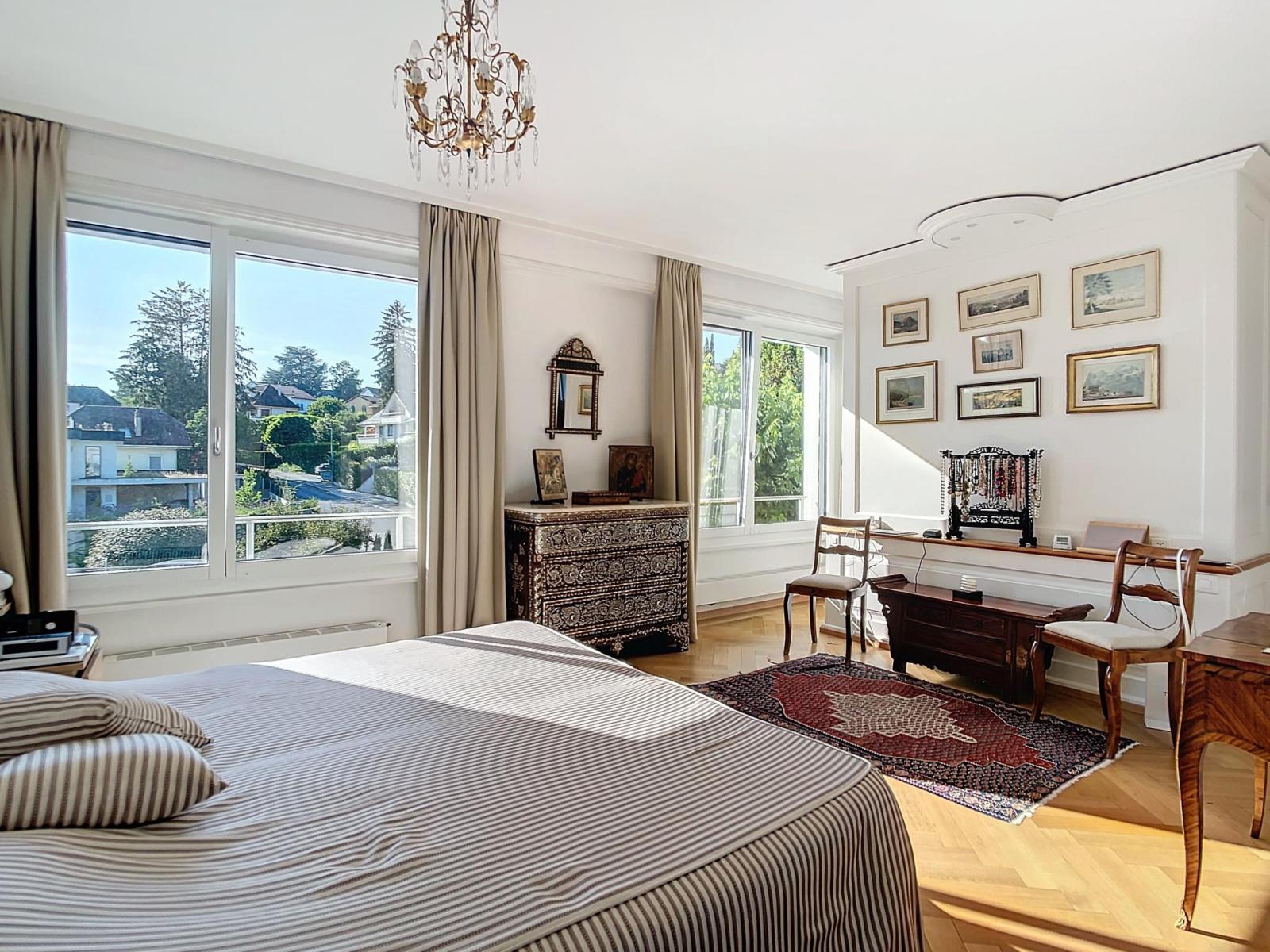 D’une surface habitable d’environ 160 m², cet appartement lumineux offre une vue imprenable sur le lac et les montagnes grâce à son orientation plein sud. L'intérieur se compose d'un vaste hall d'entrée qui distribue harmonieusement les différentes pièces de l'appartement. La partie jour inclut un grand séjour avec cheminée, ouvert sur une salle à manger, et prolongé par un balcon de 6 m². Une cuisine fermée complète cet espace convivial. La partie nuit propose en l'état trois chambres à coucher, dont une suite parentale avec dressing et salle de bain privative équipée de colonnes lave-linge et sèche-linge. Il est à noter qu'il y avait quatre chambres à coucher à l'origine et qu'il est possible de revenir au plan. Une deuxième salle de bain, est également à disposition.