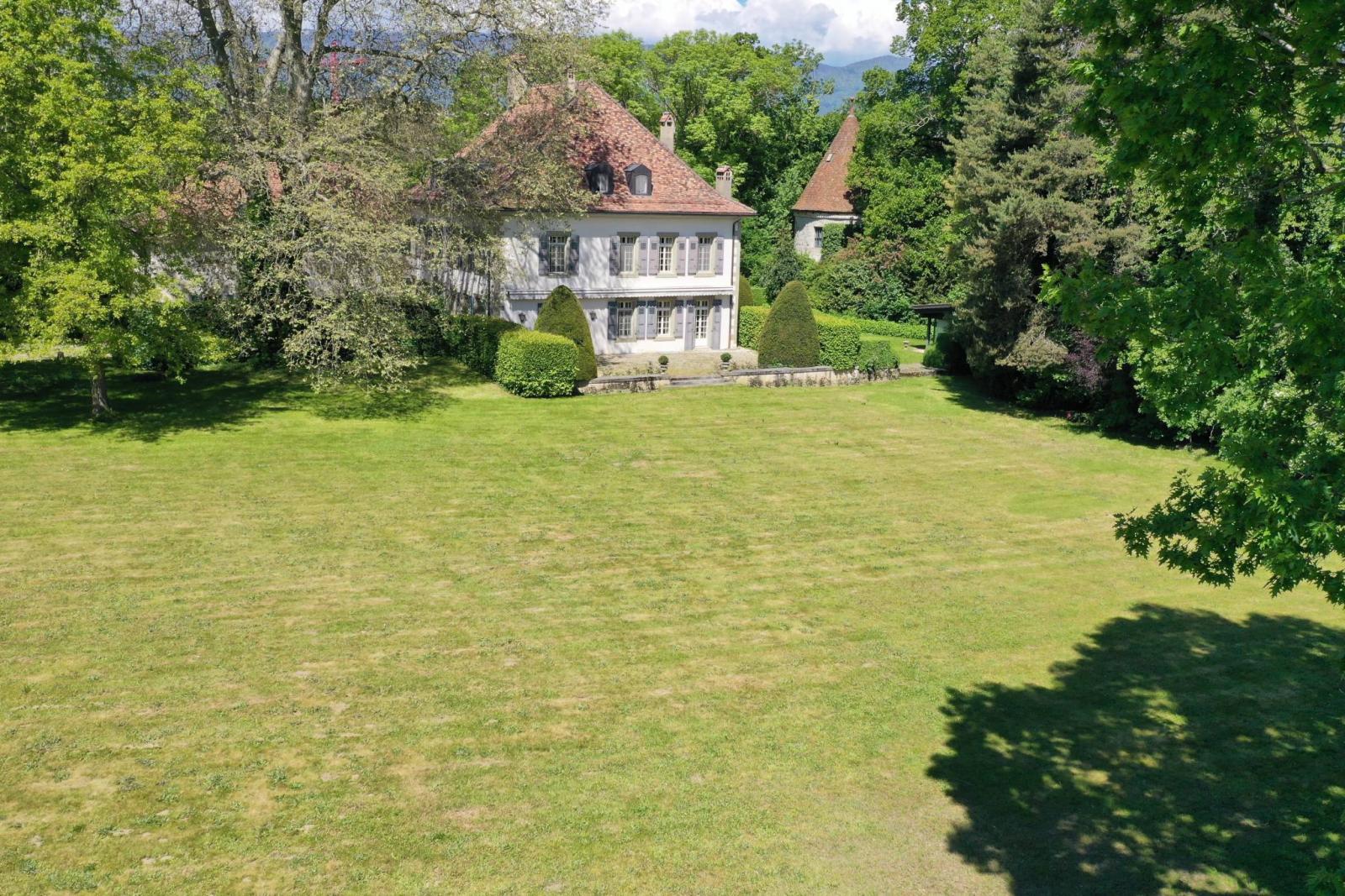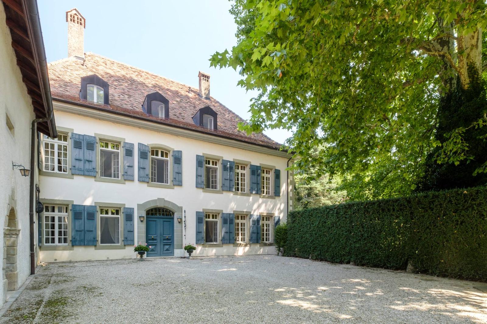 Dès le premier coup d’œil, c'est une entrée discrète qui ouvre sur un panorama bucolique, avec un merveilleux parc composé abondamment d'arbres séculaires (certains arbres sont centenaires) et même d'une jolie vue sur les Alpe s et la campagne vaudoise.