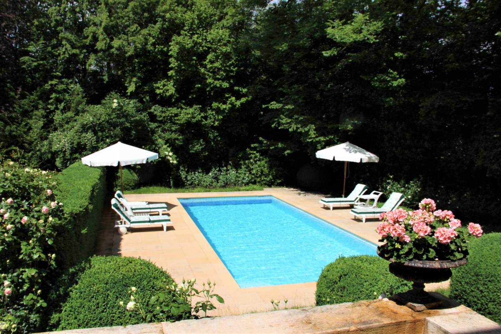 Bien orientée Sud-Ouest , une piscine creusée et chauffée (4.5 m X 12 m), est bordée par une terrasse pour agrémenter la partie loisir extérieure. Poolhouse à proximité (kitchenette, douche, WC).